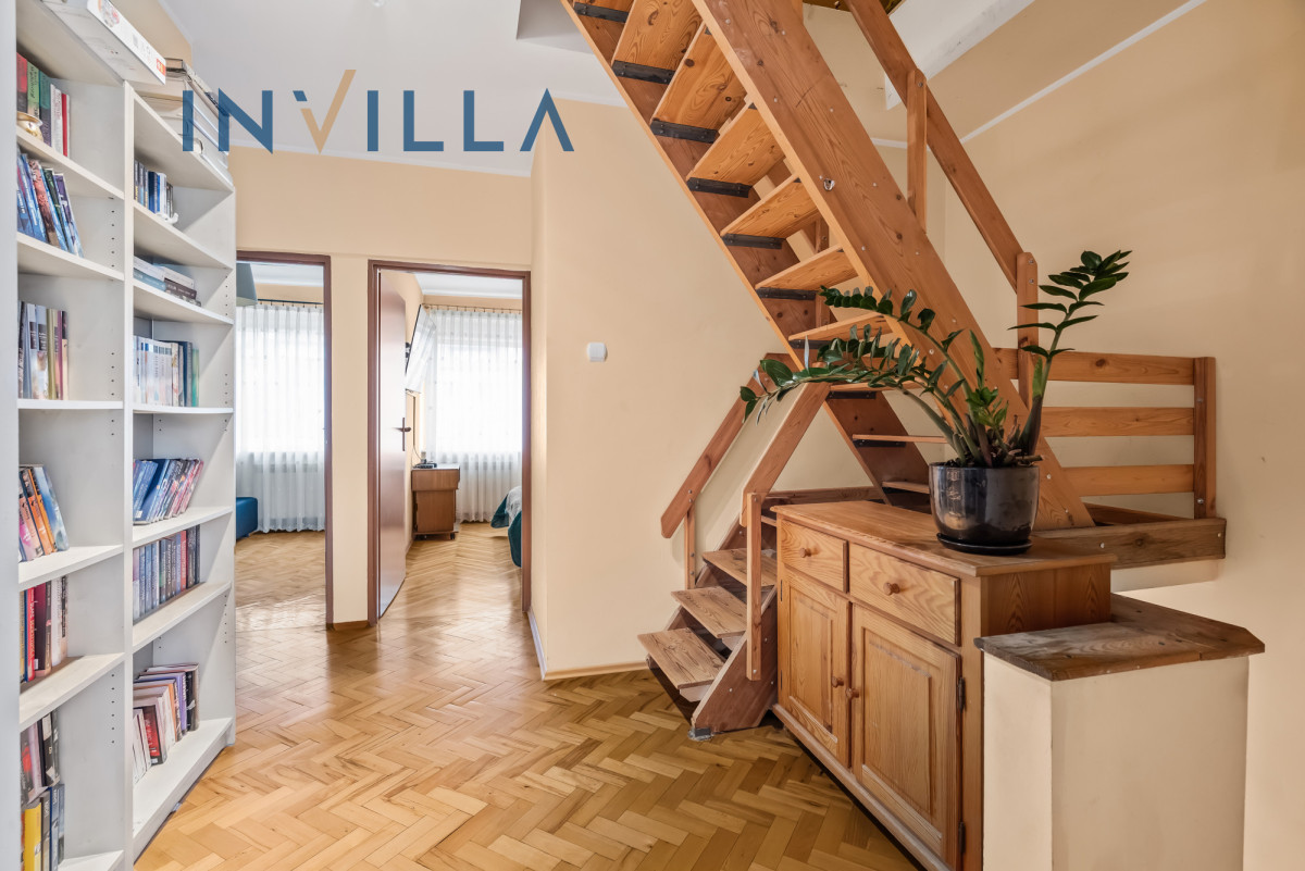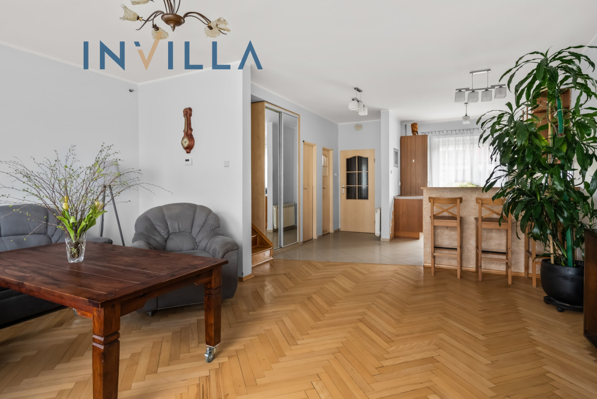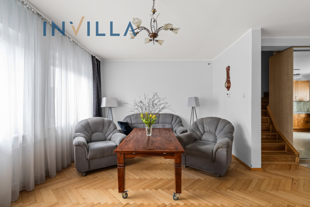 Wnętrze składa się ze strefy dziennej: dużego salonu z otwartą kuchnią oraz balkonem i toaletą o słonecznej zachodniej ekspozycji i wyjściem do ogrodu oraz części prywatnej z 4 pokojami na piętrze, łazienką i balkonem. Na podłogach parkiet w jodełkę oraz płytki w kuchni i łazienkach.