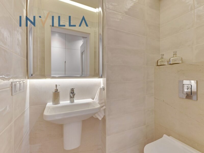 • pokój kąpielowy – ogromna wanna wpuszczana, toaleta z funkcją bidetu, na podłodze gres włoski, oświetlenie na zamówienie, umywalki Villeroy & Boch, grzejnik dwufunkcyjny, wszędzie ogrzewanie podłogowe – również pod prysznicem,
