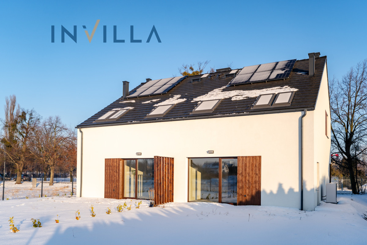 Wnętrze zachwyca przestrzenią i światłem – przestronny salon z dużymi przeszkleniami płynnie łączy się z ogrodem o powierzchni 244 m2, tworząc idealne miejsce do wypoczynku. Otwarta kuchnia, 4 sypialnie, 2 łazienki, pomieszczenie techniczne oraz pojemny strych zapewniają pełną funkcjonalność dla rodziny.