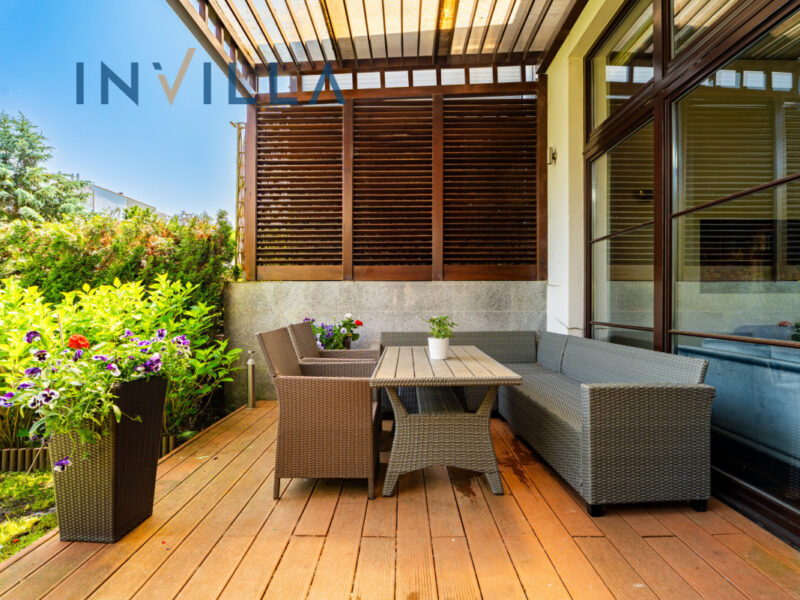 – z salonu jest wyjście na zadaszony taras o powierzchni 24 m2, który idealnie komponuje się z ogrodem,