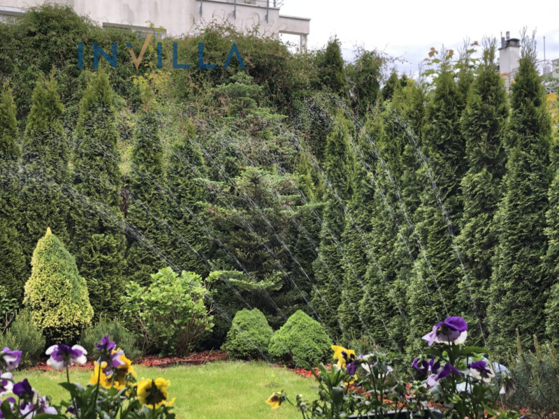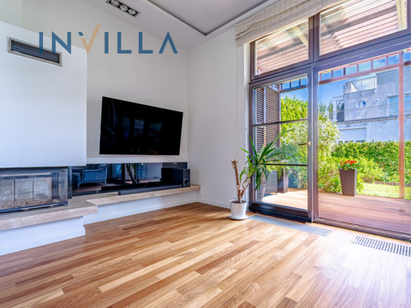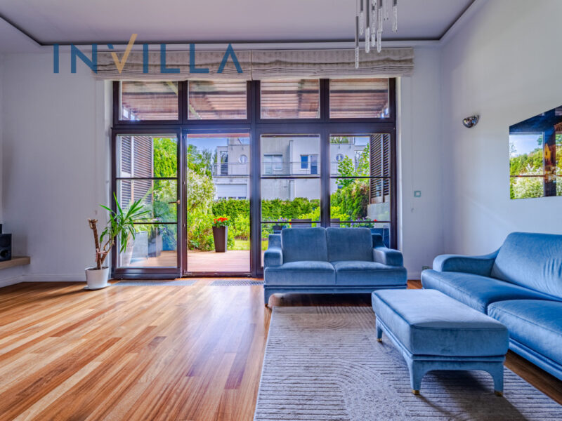 – ustawny salon z wysokim sufitem (ok 3,7 m wys.) i przeszkleniami na całej ścianie z widokiem na zadbany ogród,