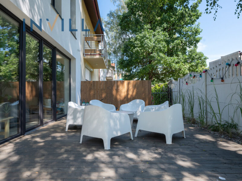 Ogród z estetycznymi nasadzeniami roślin i wygodnym tarasem sprawia, że miejsce to jest idealne do relaksu oraz spotkań rodzinnych i towarzyskich. Na terenie działki znajdują się dwa naziemne miejsca postojowe dostosowane do ładowania aut elektrycznych.