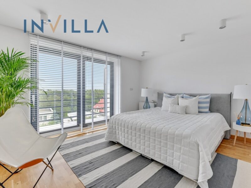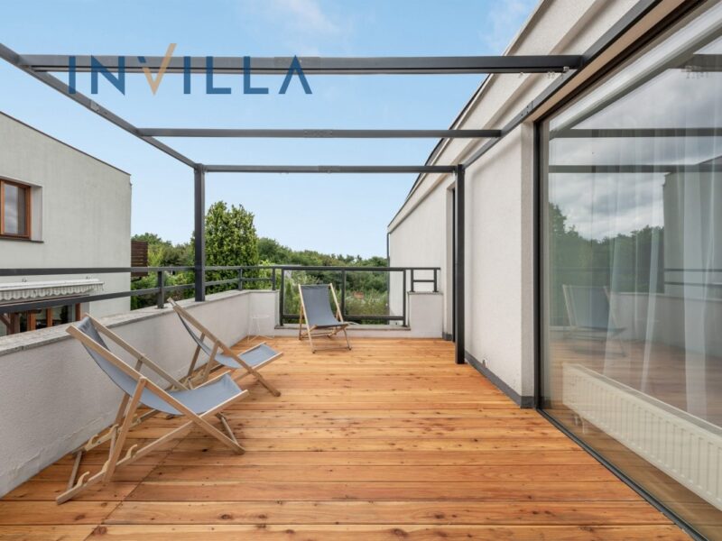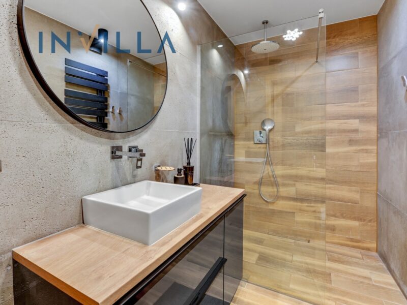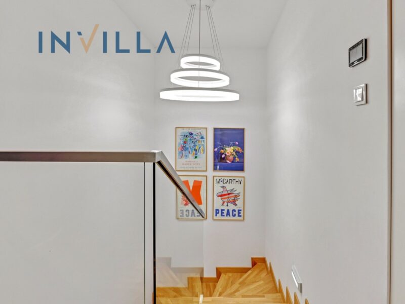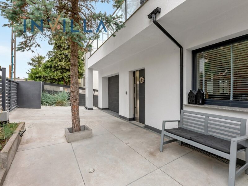 Dom wyposażono w system alarmowy i kamery, co dodatkowo zapewnia poczucie komfortu i bezpieczeństwa.