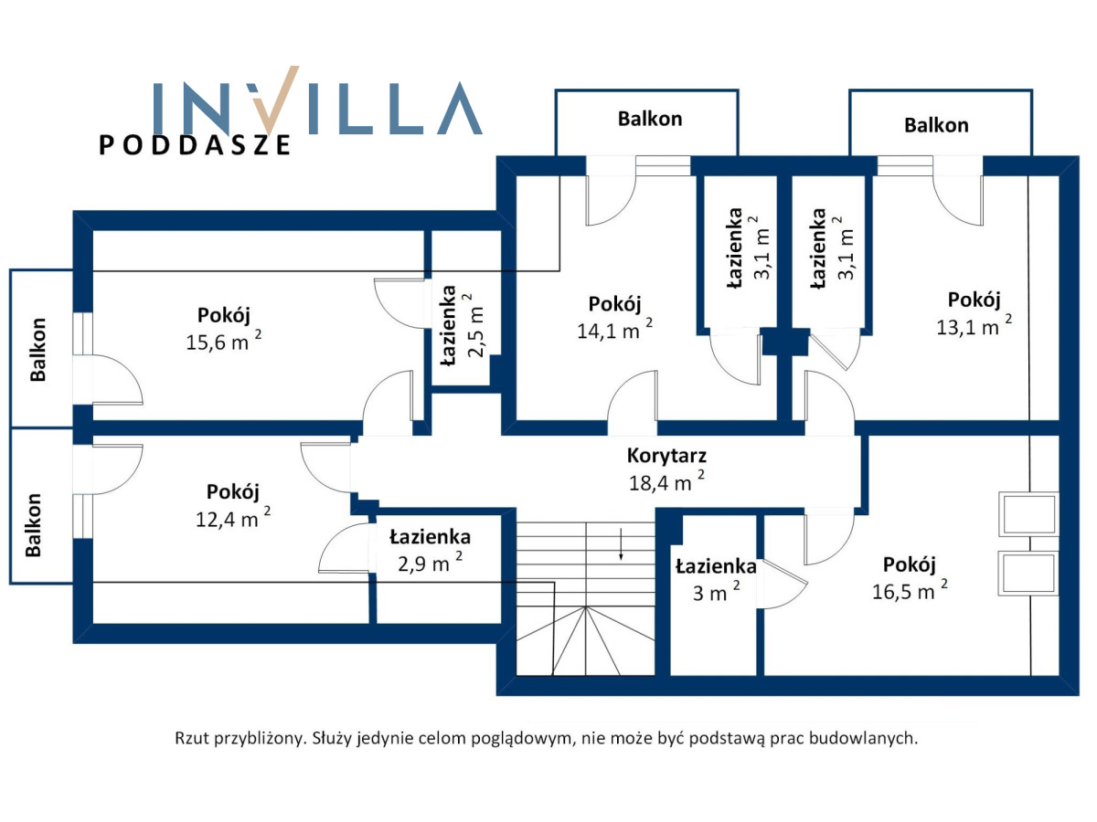 - Rozkład: kuchnia, 5 pokoi, 2 łazienki, balkon