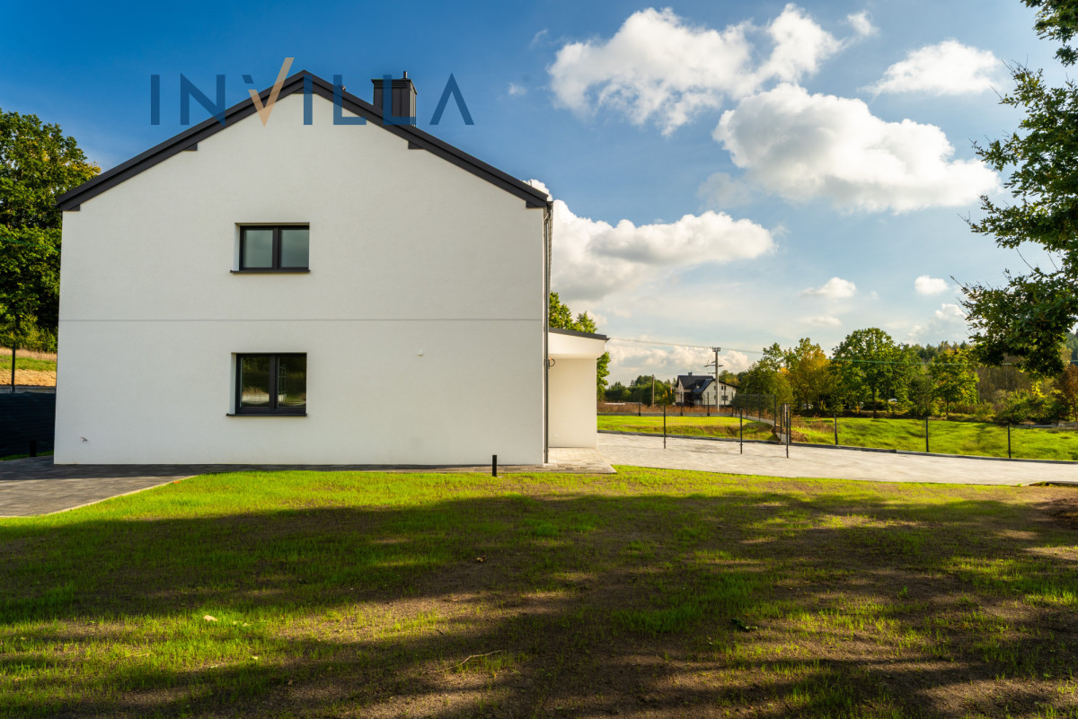Dom jest ogrodzony i wykończony w wysokim standardzie deweloperskim – okna i drzwi aluminiowe Rehau, brama garażowa Interfkex, blachodachówka, okablowanie pod monitoring, ogrzewanie podłogowe, lampy, zagospodarowany ogród z odwodnieniem.
