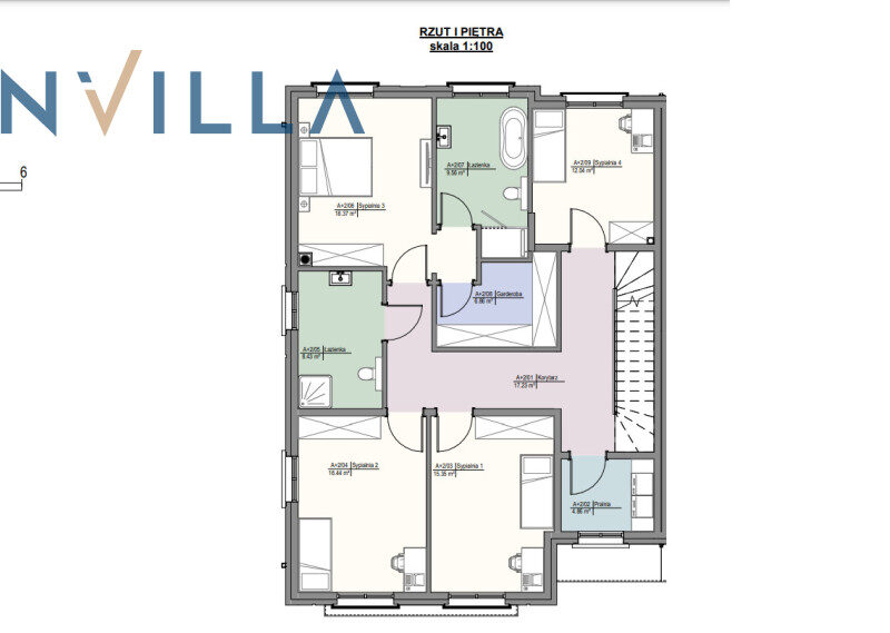 Na piętrze zaprojektowana sypialnia master z łazienką i garderobą + 3 dodatkowe sypialnie i łazienka.
