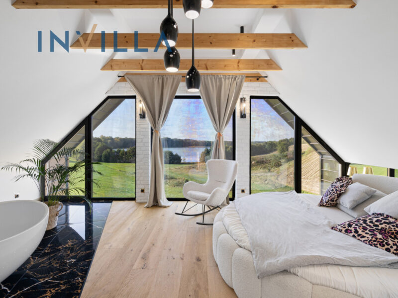 Na piętrze zaaranżowana została przestronna sypialnia z widokiem na jezioro oraz osobna łazienka zapewniając komfort i prywatność.