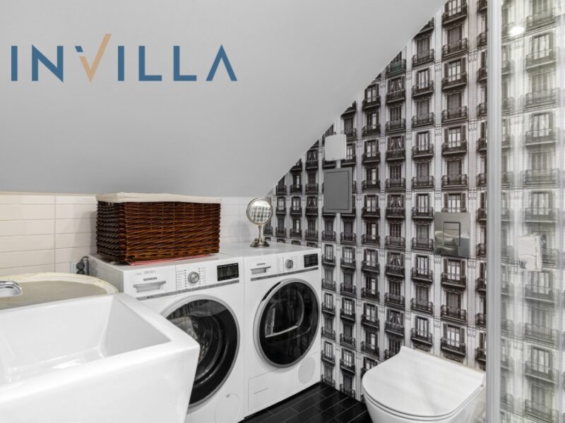 Poddasze to powierzchnia open space, spełniająca rolę dodatkowego, niezależnego pokoju z łazienką (pralka i suszarka) i miejscem do pracy.