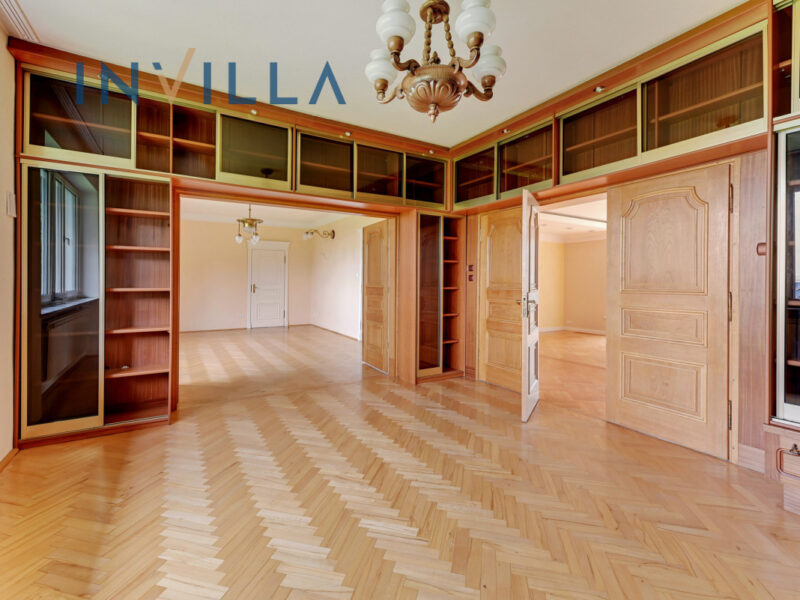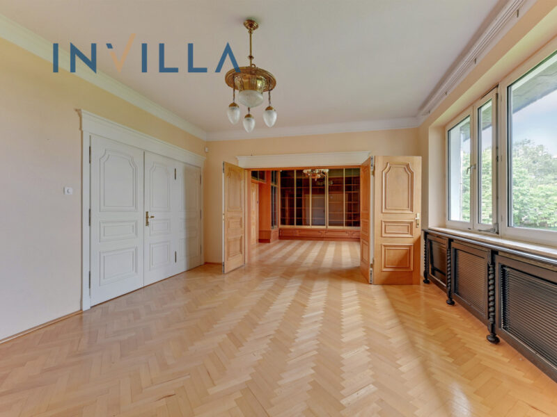 PARTER – salon z kominkiem i wyjściem na taras, 3 sypialnie z łazienkami, jadalnia, biblioteka, pom. gospodarcze, spiżarnia, toaleta.