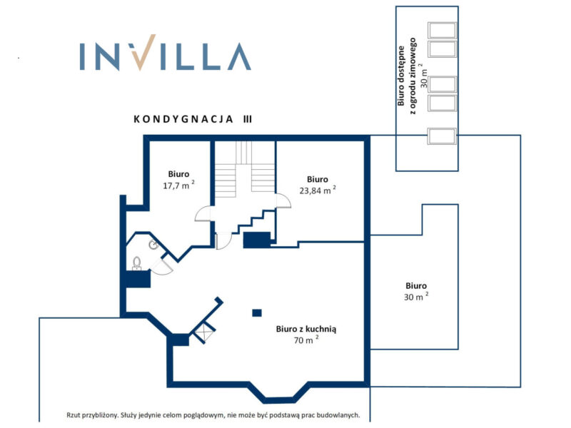 Niewątpliwym atutem tej nieruchomości jest przestronny, przeszklony ogród zimowy ze świetnie zachowaną roślinnością. Jest to wyjątkowa przestrzeń, która może służyć zarówno jako miejsce relaksu, jak i kreatywnych spotkań zespołowych czy spotkań z klientami.