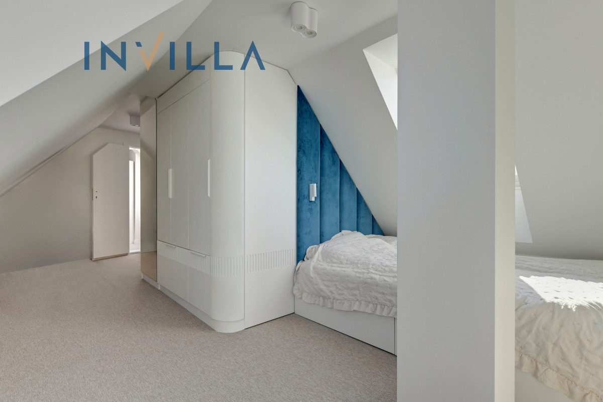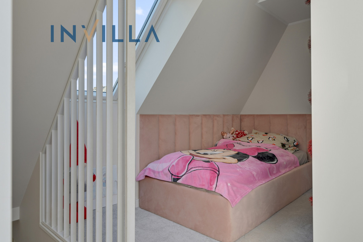 Drugi poziom obejmuje dwie dodatkowe sypialnie z miejscem do pracy przy biurku. Z okien poddasza również można podziwiać widok na plażę oraz wodę.