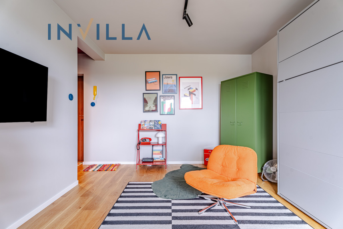 – pokój z aneksem kuchennym, łazienka z prysznicem typu walk-in, zabudowa z pralką, łóżko w zabudowie + dodatkowy fotel z funkcją spania,