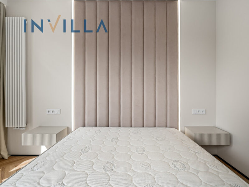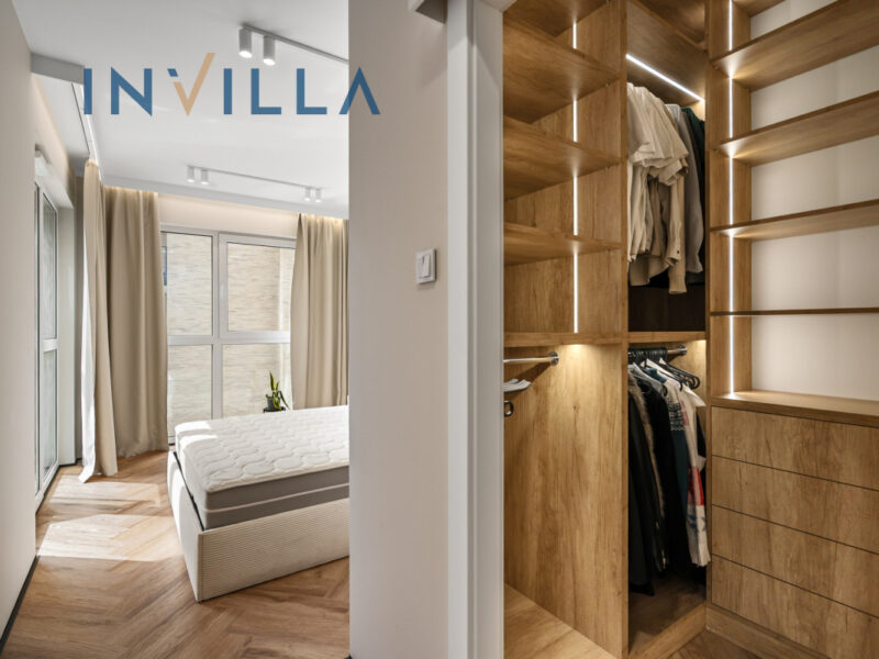 - wygodnej sypialni z podwójnym łóżkiem z sąsiadującą, praktycznie urządzoną garderobą oraz drugim wyjściem na loggię,