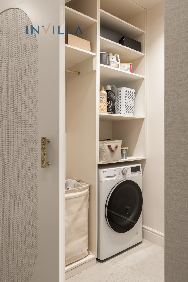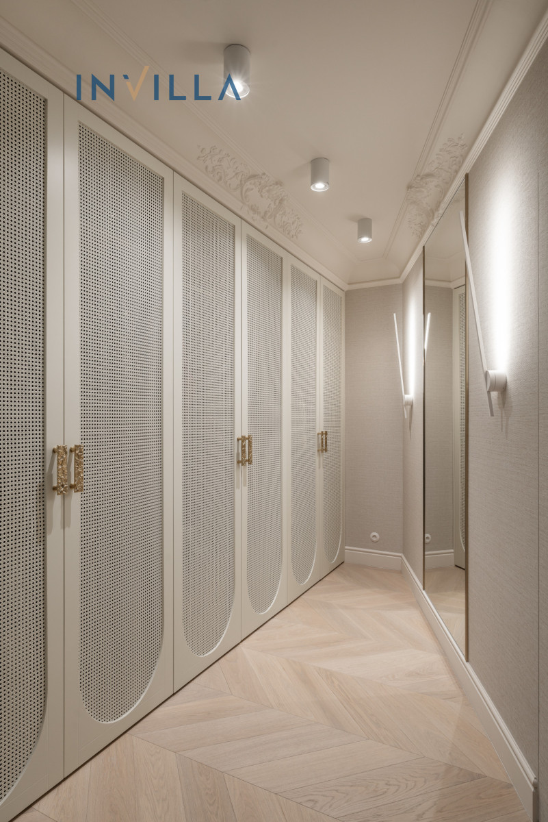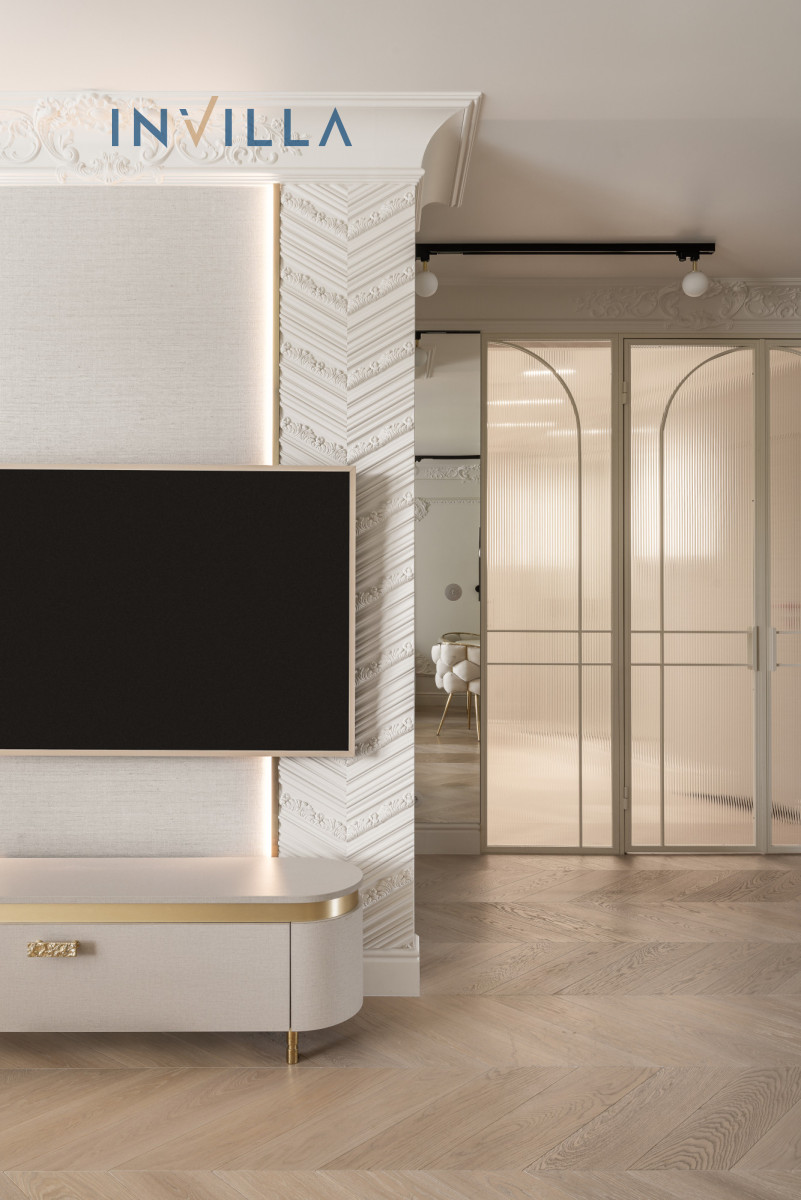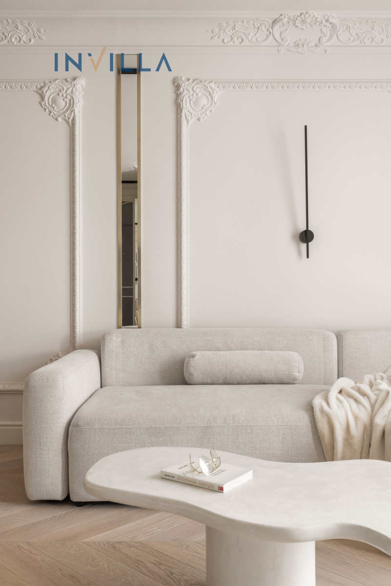 Wnętrze zostało zaprojektowane z dbałością o każdy detal. Olejowana, dębowa podłoga ułożona w jodełkę, kamienne blaty w kuchni oraz wykonane na zamówienie zabudowy stolarskie tworzą harmonijną, spójną i ponadczasową przestrzeń. Całość łączy wysoką estetykę z pełną funkcjonalnością.