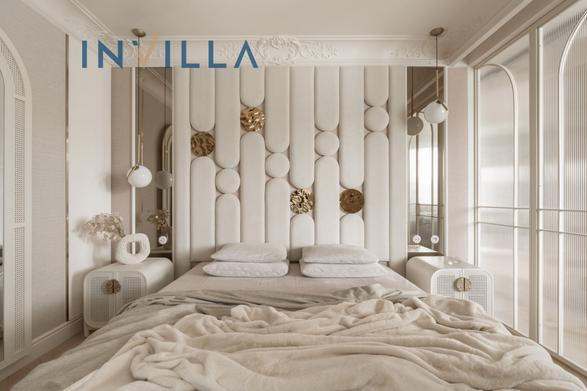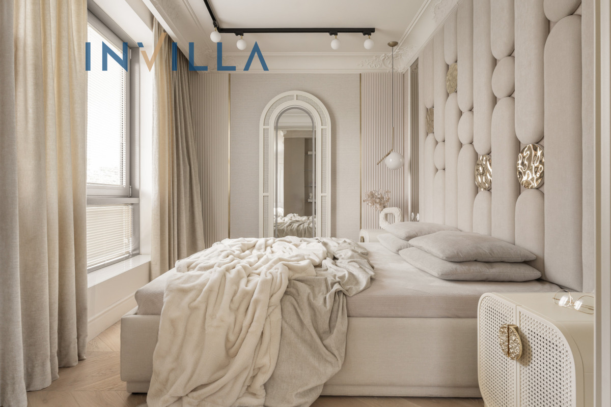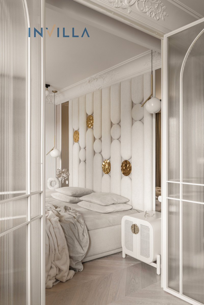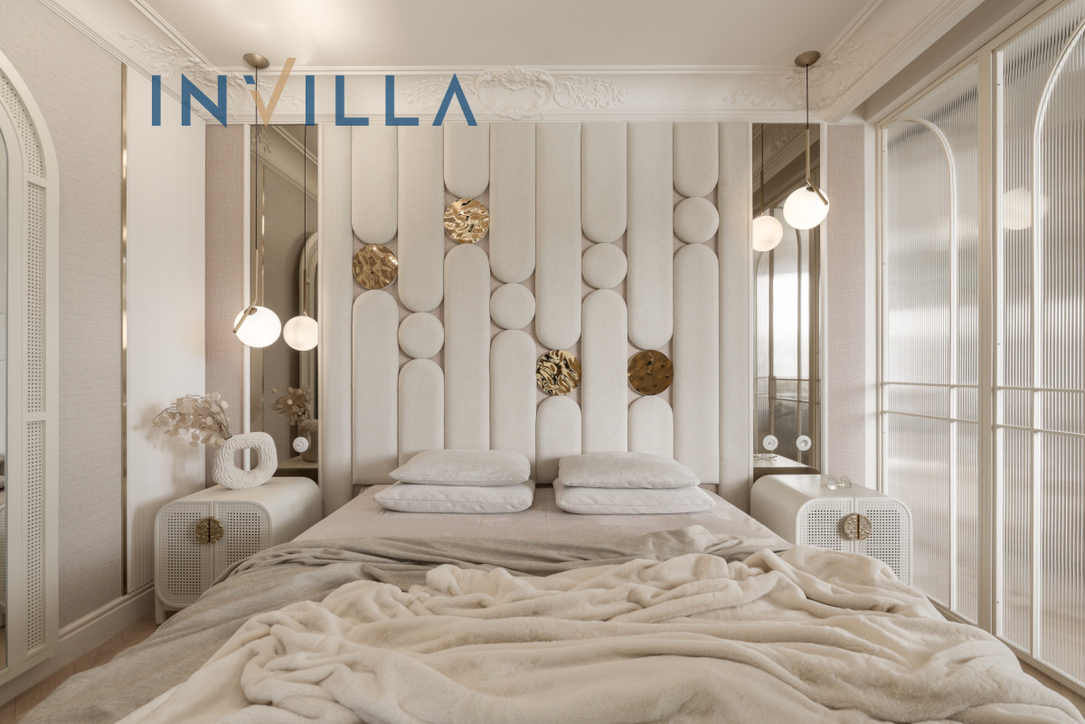 - klimatyczna sypialnia z dużym tapicerowanym łóżkiem i designerskim oświetleniem,