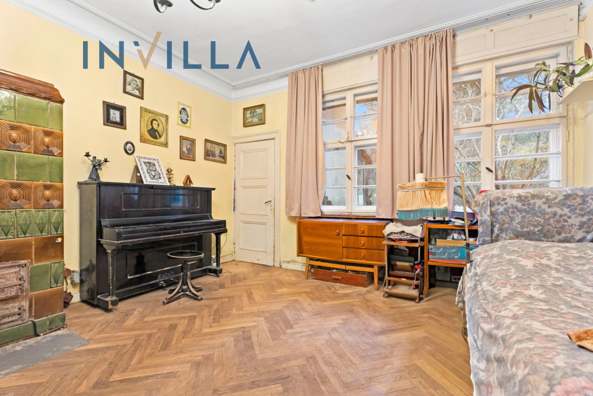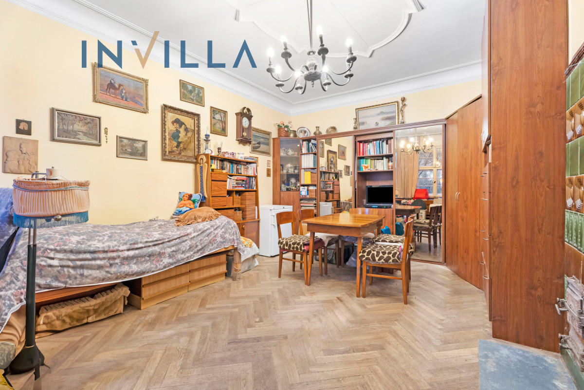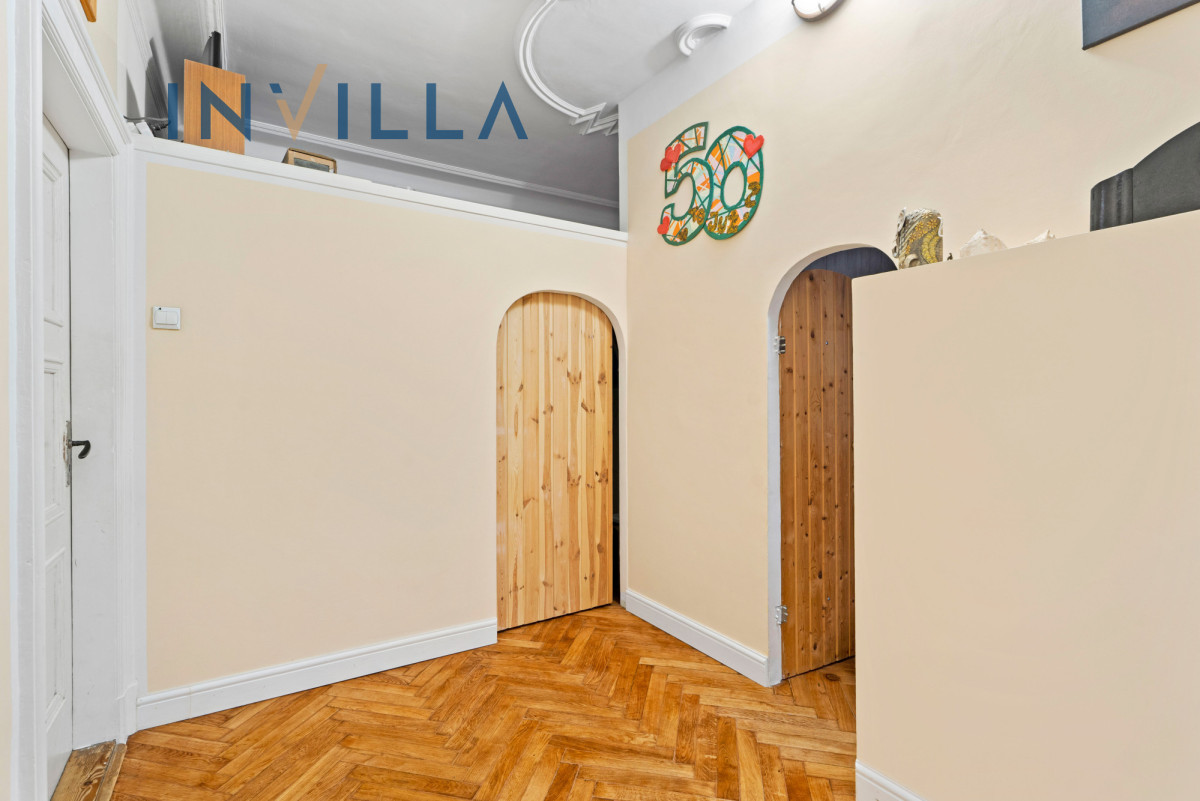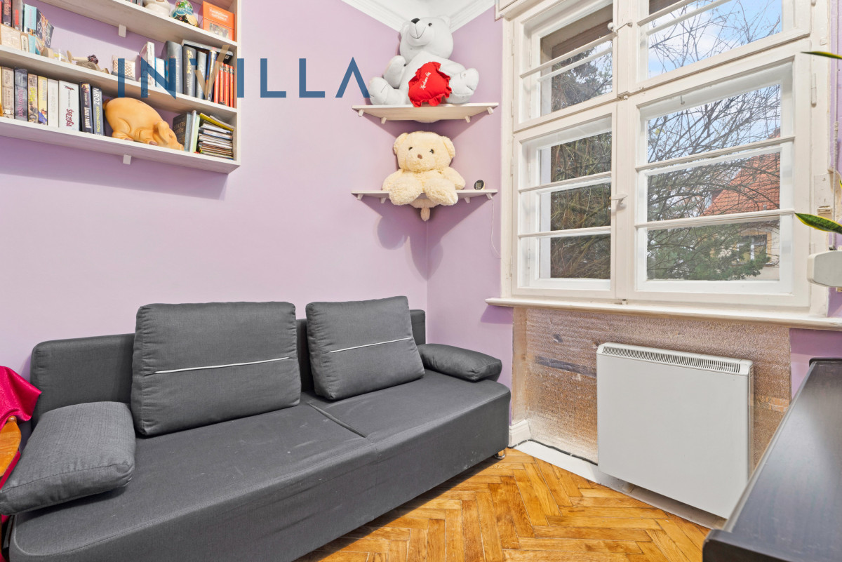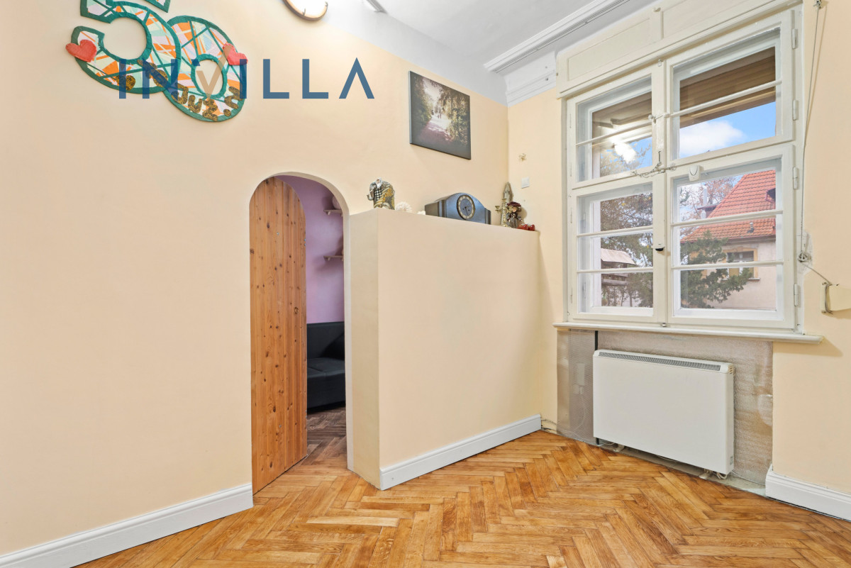 Obecnie mieszkanie było zaadoptowane pod rodzinę i zostało podzielone, ale łatwo można przywrócić oryginalny układ pomieszczeń. Dotatkowa przestrzeń przynależna do lokalu, jest zaadoptowana w piwnicy. Może być gabinetem lub pracownią.