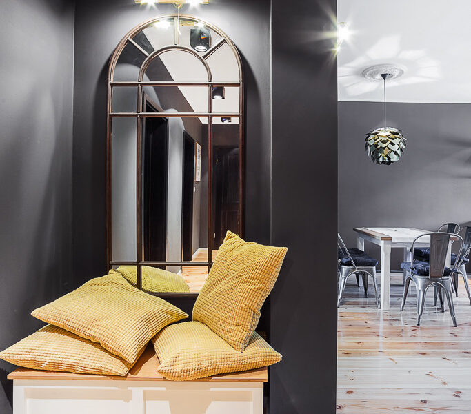 Odsłonięta drewniana belka stropowa oraz sosnowa duża deska podłogowa nadają ciepły klimat mieszkaniu, natomiast ciemne barwy ścian i nowoczesne dodatki zdecydowanie odmładzają w eklektyczny sposób jego wyraz. Mieszkanie posiada ekspozycję dwustronną i dużą ilość okien, także połaciowych, co powoduje, że jest dobrze doświetlony. Istnieje możliwość zaadoptowania tarasu na dachu kamienicy, co może jeszcze powiększyć przestrzeń życiową.