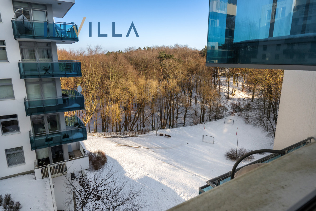 Niewątpliwym atutem jest przestronny balkon z dużą ilością wpadającego światła dziennego oraz widokiem na las, zapewniający ciszę, prywatność i bezpośredni kontakt z naturą.