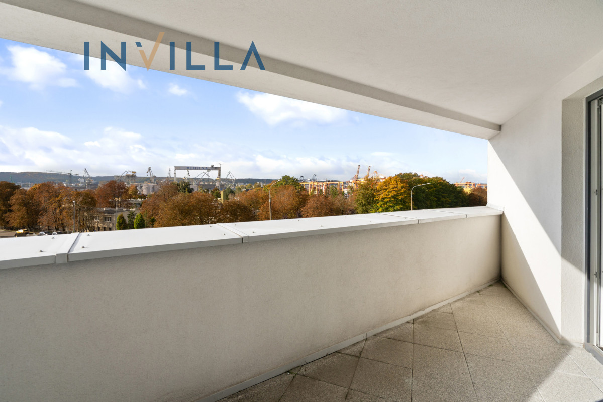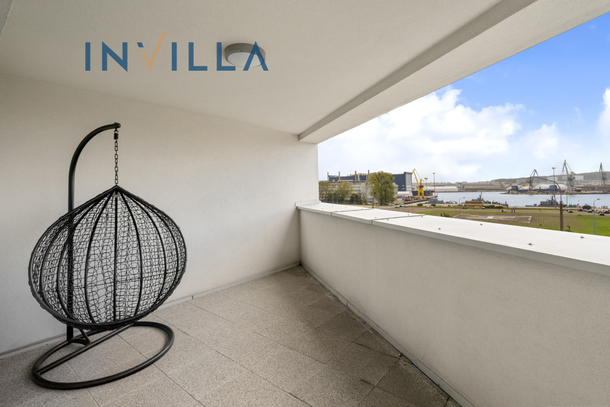 - salon z aneksem kuchennym i wyjściem na dużą loggię z widokiem na morze i Port Gdynia,