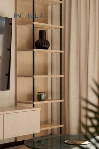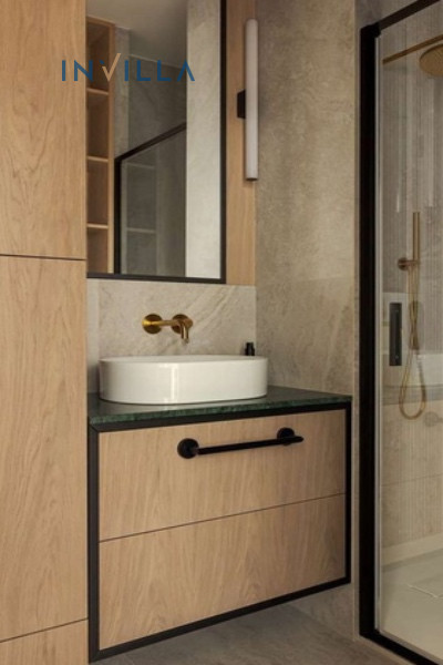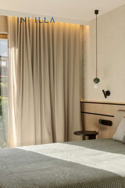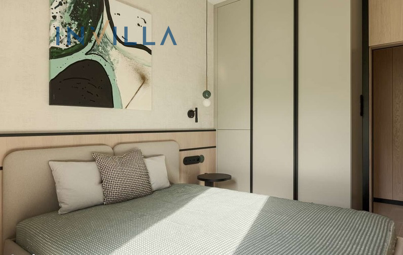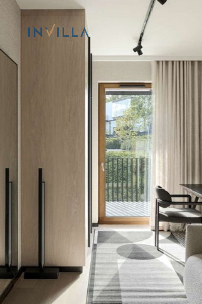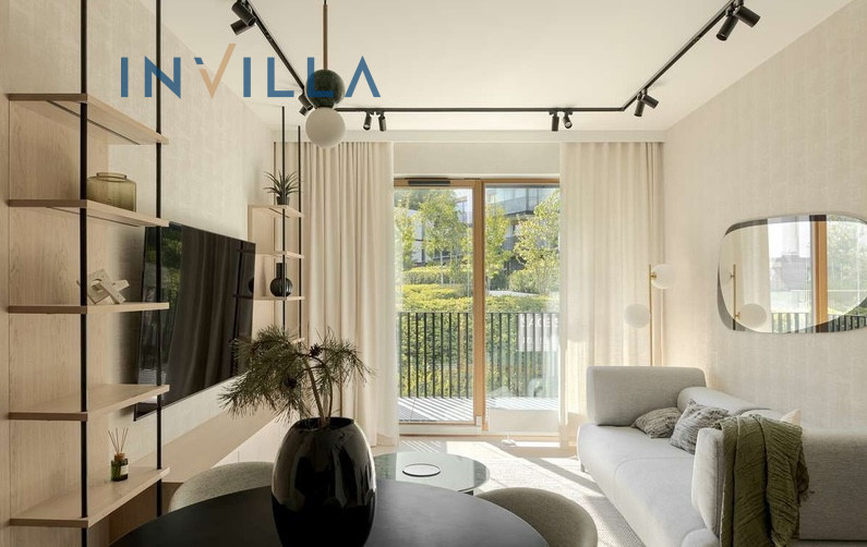 Mieszkanie o powierzchni 56,89 m2 składa się z dwóch wygodnych sypialni, jasnej części dziennej z panoramicznymi oknami oraz otwartą kuchnią, a także łazienki wykończonej z naturalnych materiałów. Zachodnia ekspozycja zapewnia piękne światło dzienne i zachody słońca nad koronami drzew. Wykończenie i wyposażenie – podłoga: naturalny, bielony dąb marki DABEX – zabudowy meblowe: fornir dębowy bielony, wykonany na zamówienie – blaty kuchenne i łazienkowe: marmur naturalny Verde Alpi – oświetlenie: wiszące lampy hiszpańskiej marki Aromas del Campo – tapety tkaninowe: ekskluzywna marka Casamance.