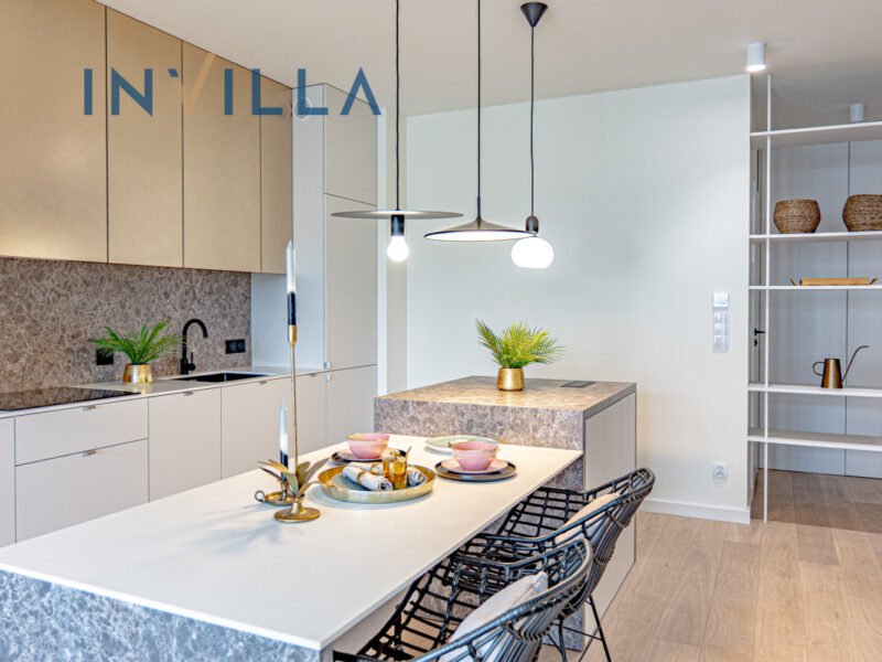 Wykończona materiałami najwyższej jakości, z dbałością o detale. Nowoczesna armatura, funkcjonalne rozwiązania oraz ponadczasowy design podkreślają charakter apartamentu premium.