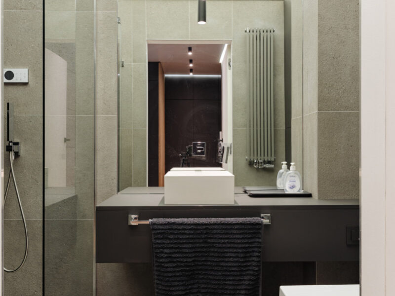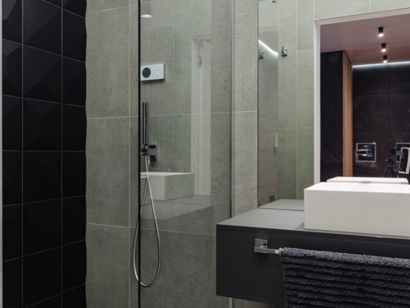 • Łazienka: kabina prysznicowa typu walk-in z deszczownicą, sufit napinany z nastrojowym podświetleniem.