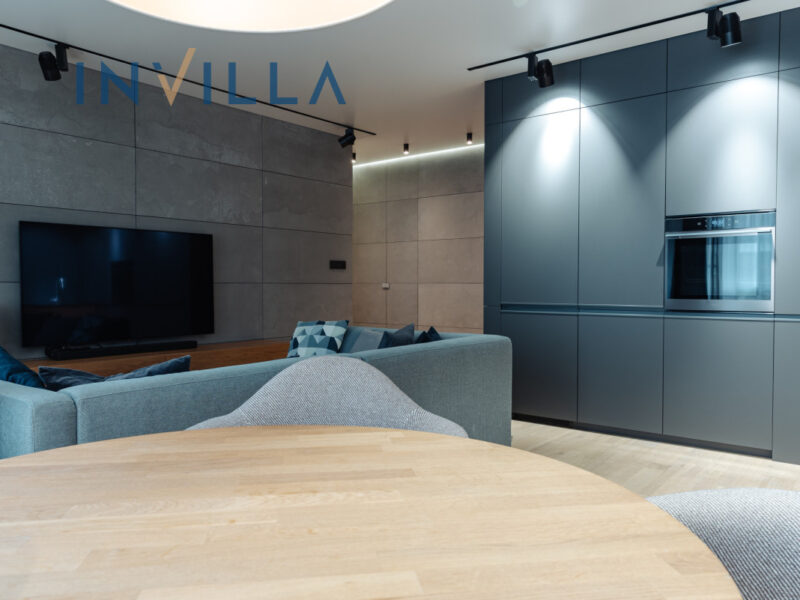 • Salon z aneksem kuchennym: zabudowa na wymiar, AGD, TV 65″, dębowy stół wraz z krzesłami, nowoczesna sofa z funkcją spania, przeszklony wykusz, wyjście na balkon.