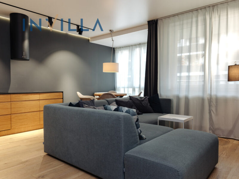• Salon z aneksem kuchennym: zabudowa na wymiar, AGD, TV 65″, dębowy stół wraz z krzesłami, nowoczesna sofa z funkcją spania, przeszklony wykusz, wyjście na balkon.
