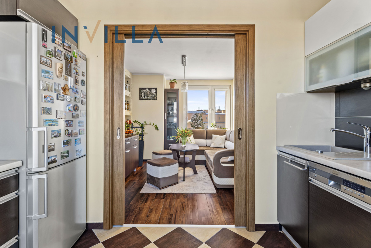 - pokój połączony z kuchnią wyposażoną we wszystkie sprzęty AGD, oddzielony przesuwanymi drzwiami,