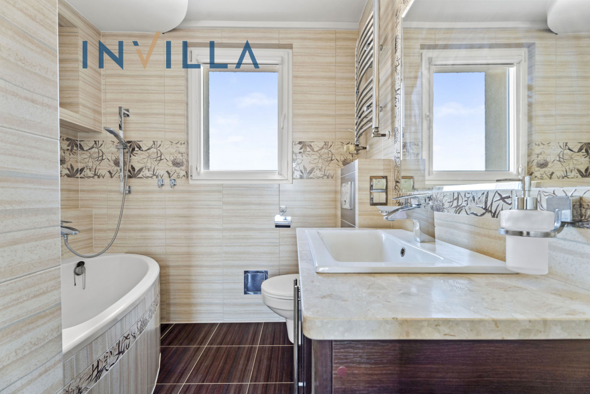 - łazienka z oknem, wyposażona w wannę,
