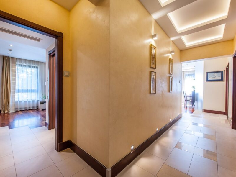 Elegancki apartament o powierzchni 132 metrów kwadratowych, położony na pierwszym piętrze. Główną część wnętrza stanowi przestronny salon, o południowej i zachodniej ekspozycji, z częścią wypoczynkową i jadalnianą oraz balkonem. Bezpośrednio obok znajduje się duża kuchnia, ze stylową wyspą i wysokiej jakości zabudowami, a także częścią dedykowaną pod codzienne spożywanie posiłków. Kolejnym atutem mieszkania jest sypialnia w konwencji tzw. master bedroom, z własną łazienką z jacuzzi, garderobą, balkonem oraz wydzieloną częścią do pracy. Dopełnieniem całości jest pokój gościnny, druga łazienka z częścią gospodarczą oraz spinający całość przestronny korytarz, będący osią komunikacyjną całego mieszkania. Wnętrza wykonane z dbałością o detale, z wysokiej jakości materiałów, przy jednoczesnym nacisku kładzionym na wysoką funkcjonalność. Apartament posiada system klimatyzacji, ogrzewanie podłogowe, rozbudowany system oświetlenia oraz wiele innych udogodnień. Na podłogach włoski gres, drewno Jatoba oraz Merbau. Kuchnia drewniana, w pełnej zabudowie ze sprzętami Siemens, Electrolux oraz Liebherr, z granitowym wykończeniem cokołów i blatów.