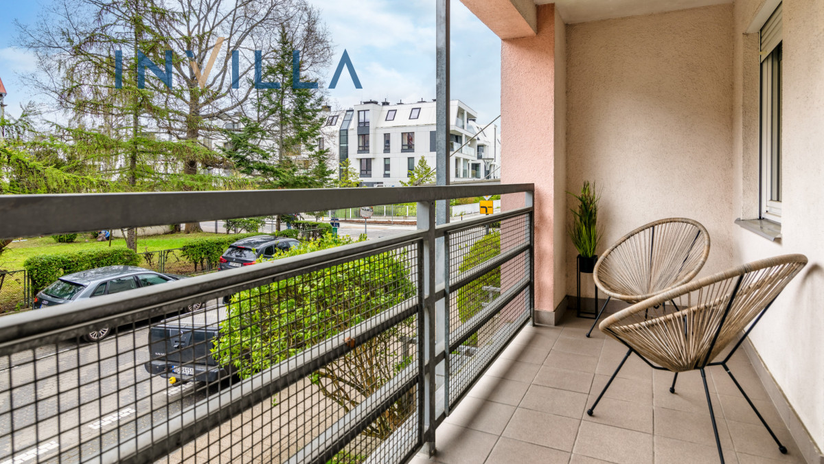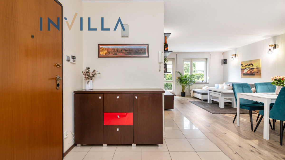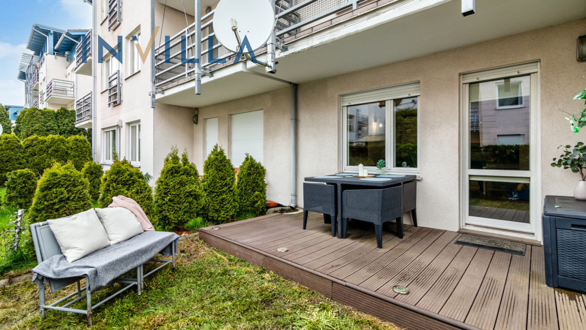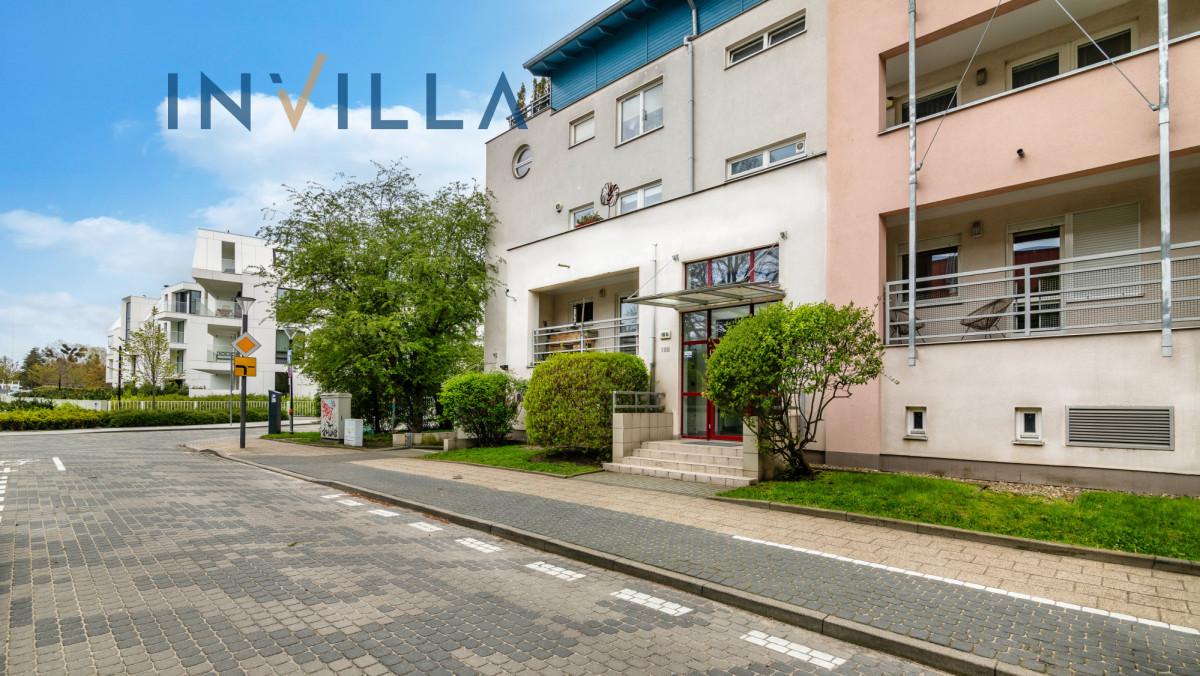 Mieszkanie znajduje się na wysokim parterze budynku, dzięki temu oferuje zarówno ogródek z zaaranżowanym tarasem, jak i balkon. Z klatki schodowej można bezpośrednio zejść do hali garażowej.