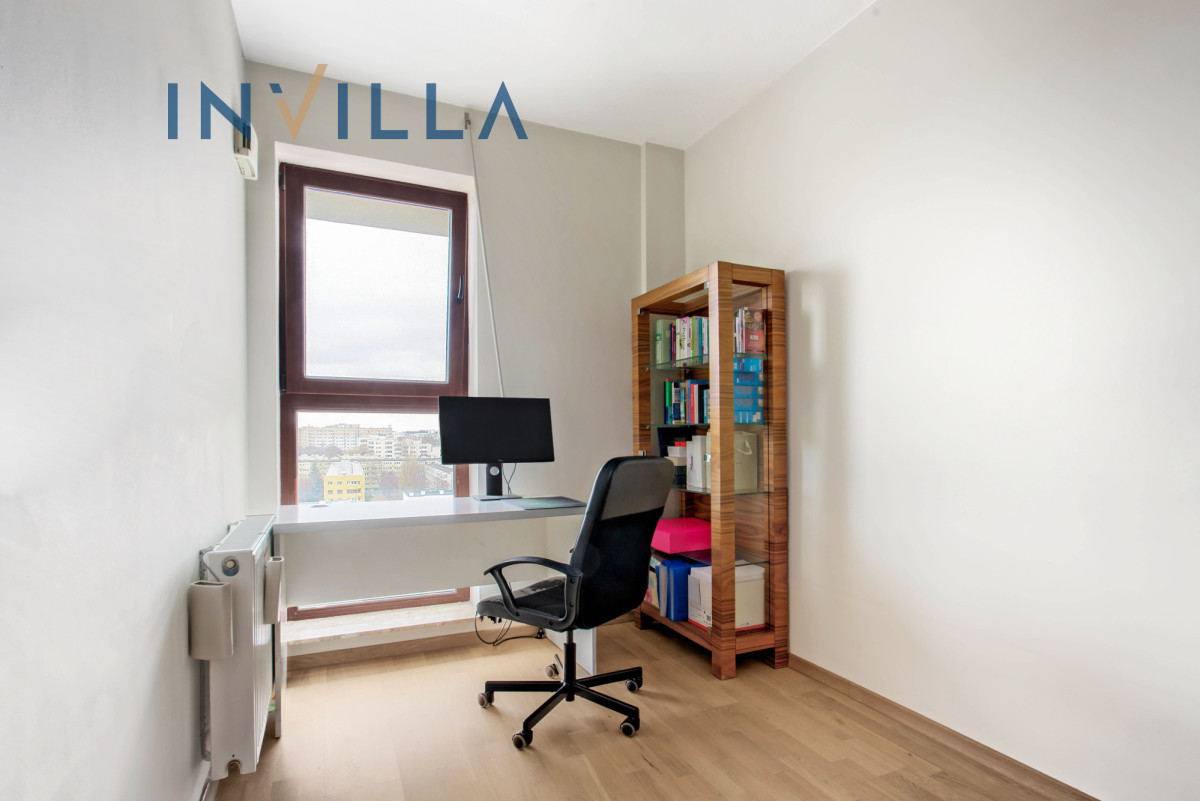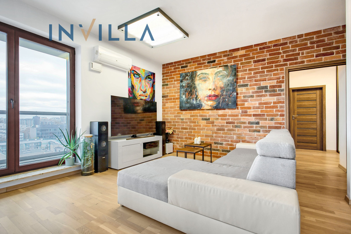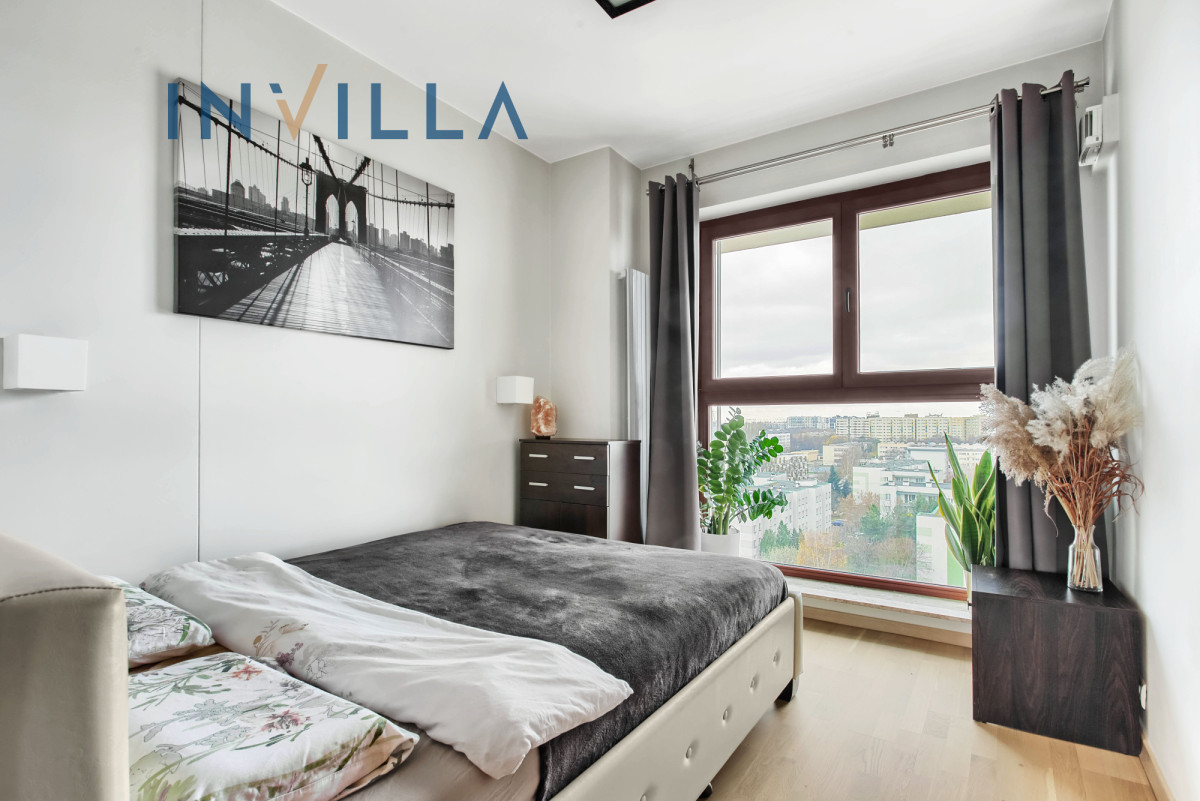 Oferujemy przestronne mieszkanie o powierzchni prawie 65 m², usytuowane na 9. piętrze (przedostatnia kondygnacja), dzięki temu jest bardzo słoneczne z ekspozycją południowo-zachodnią. Serce apartamentu to salon połączony z aneksem kuchennym o powierzchni około 25 m², z którego jest wyjście na duży balkon (ok. 8 m²). Balkon zapewnia piękny widok na zieleń oraz panoramę centrum Warszawy.