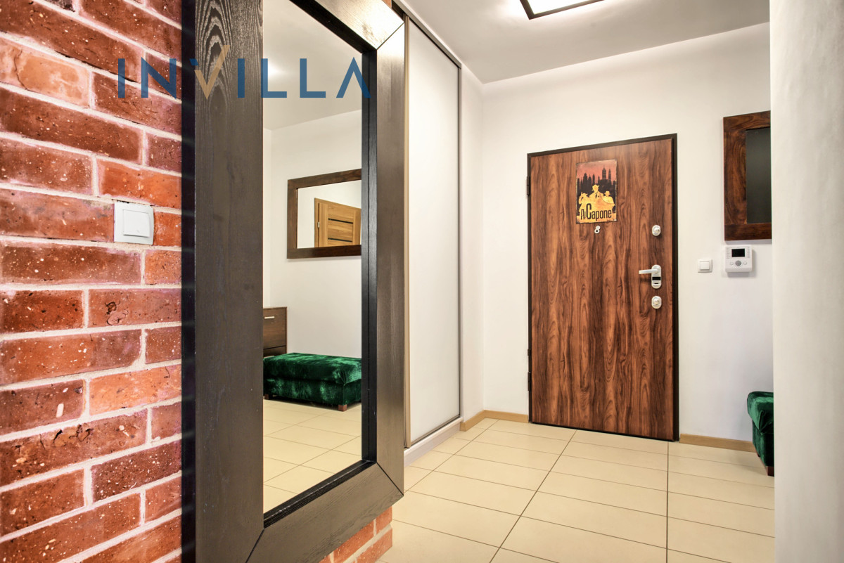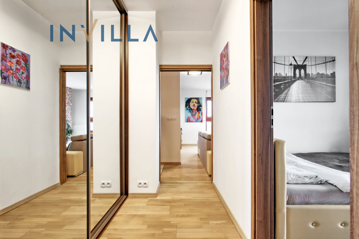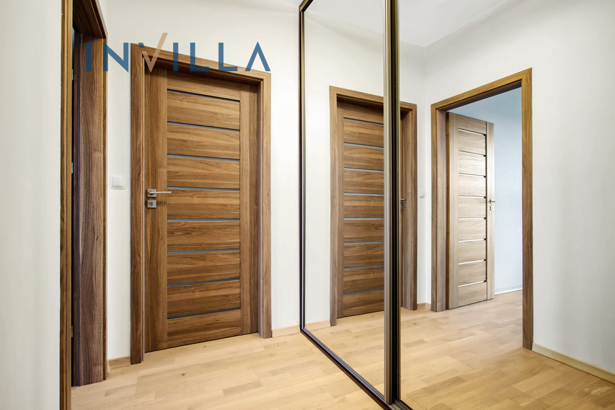 Druga część mieszkania to dwie sypialnie (8,5 i 8,9 m²), obecnie wykorzystane jako sypialnia i gabinet, które można wygodnie oddzielić od reszty apartamentu dzięki przesuwnym drzwiom. Przestronny hall wyposażony jest w dwie duże, w zabudowie szafy z lustrzanymi frontami — idealne do przechowywania.