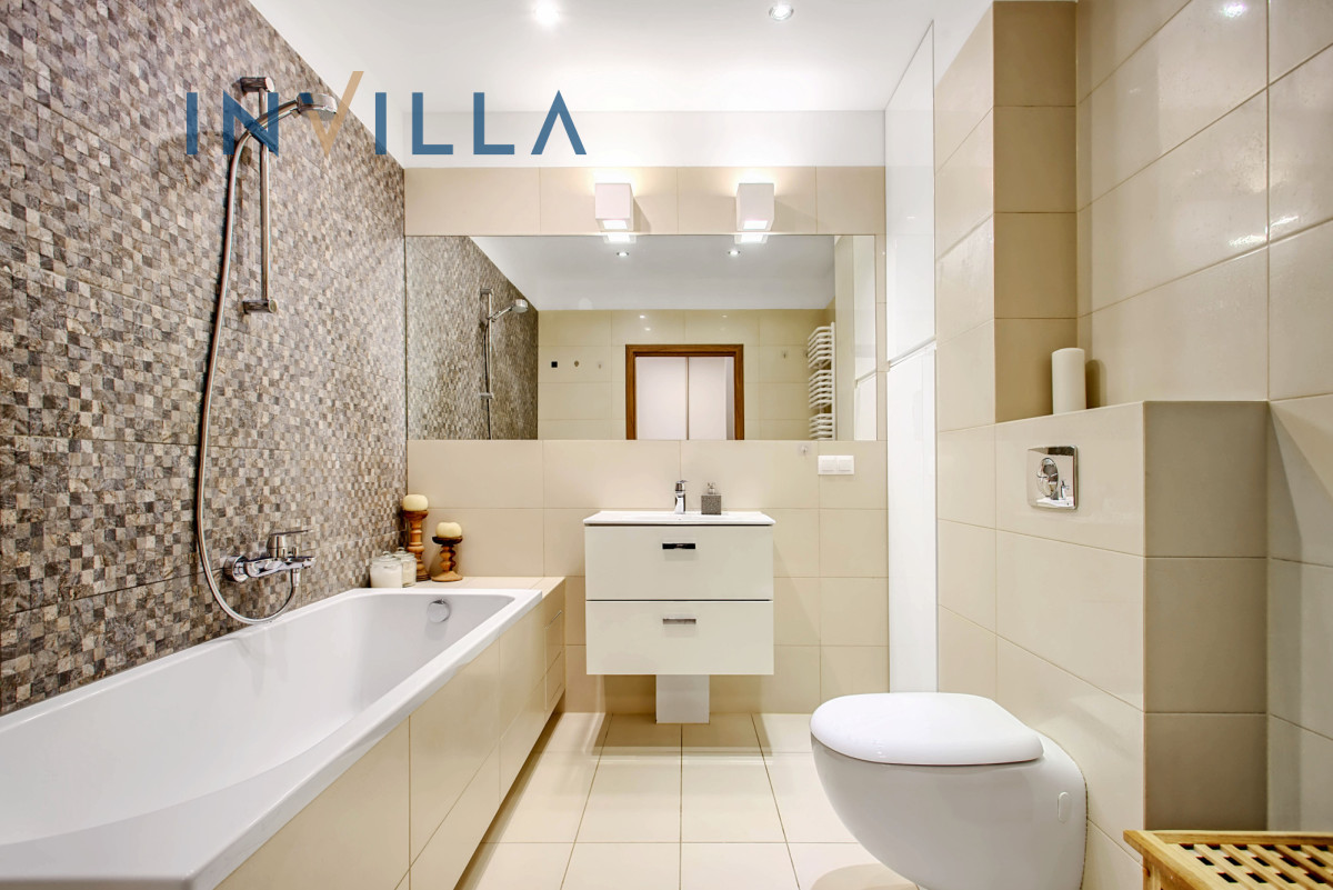Łazienka została wyposażona zarówno w wannę, jak i kabinę prysznicową, a także w zabudowaną pralkę. W całym mieszkaniu zadbano o funkcjonalne miejsce do przechowywania, które ułatwia organizację codziennych spraw.