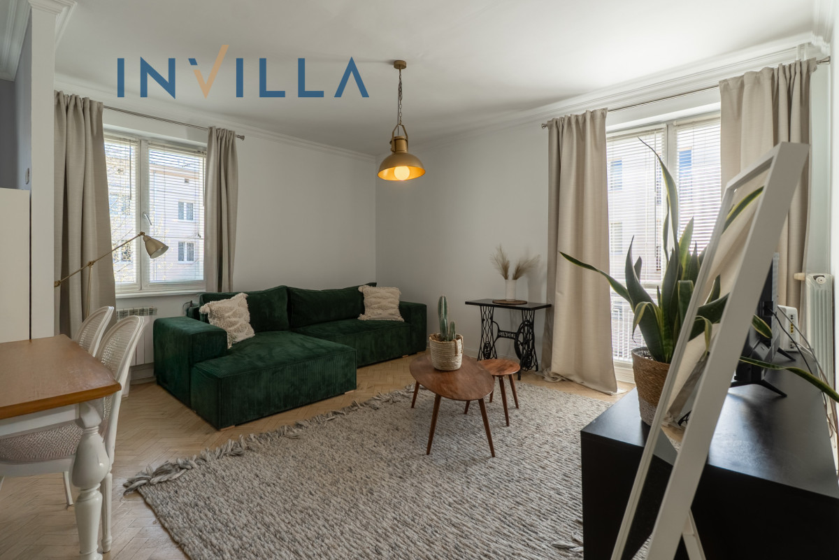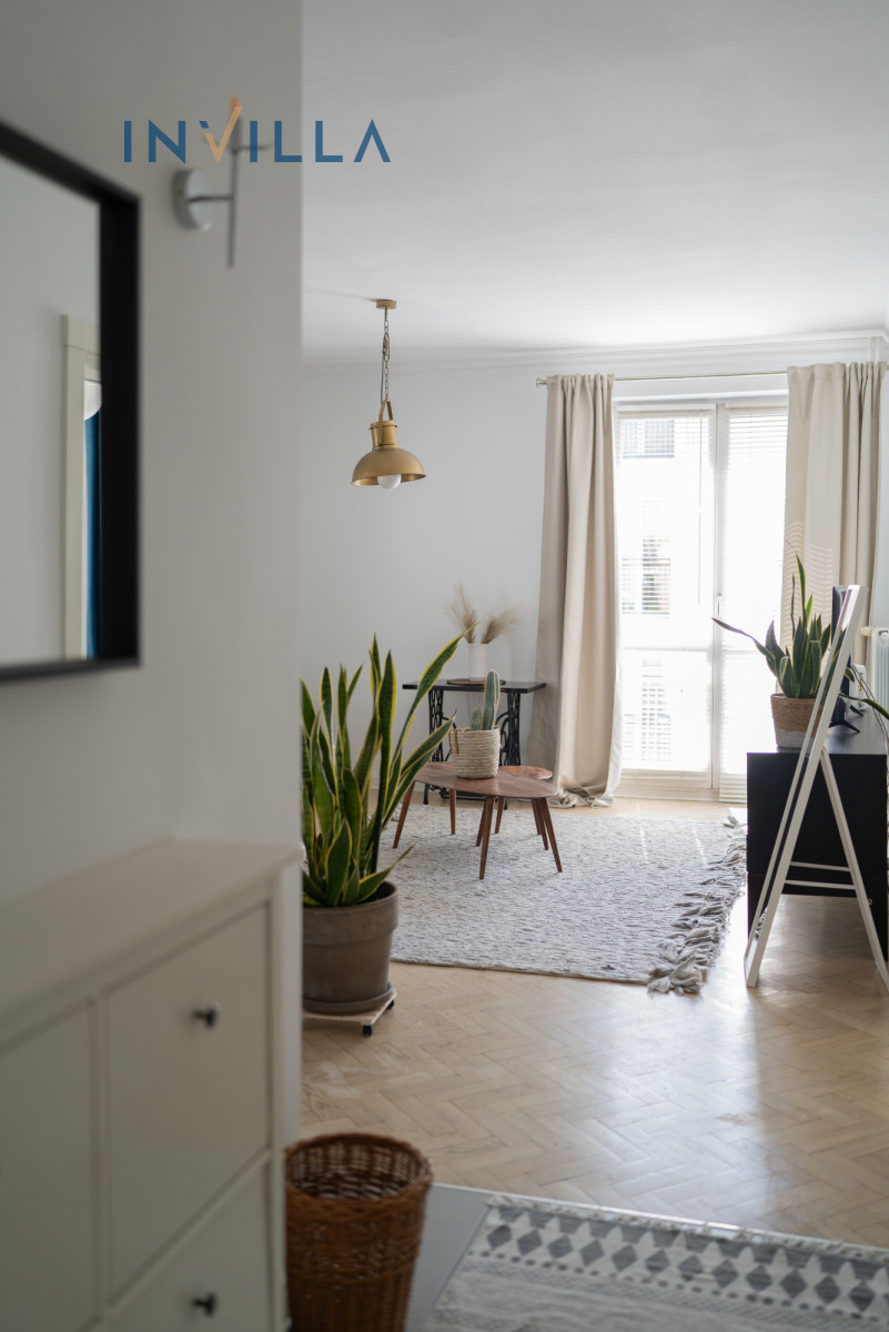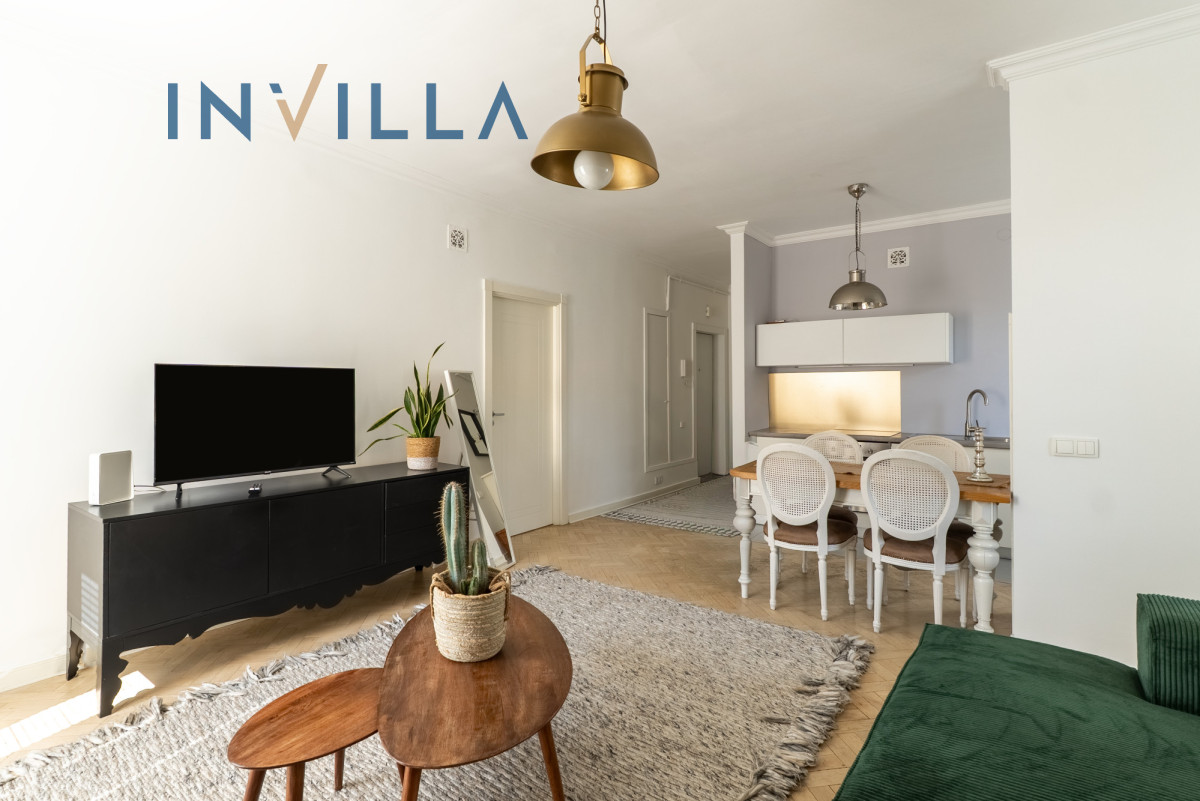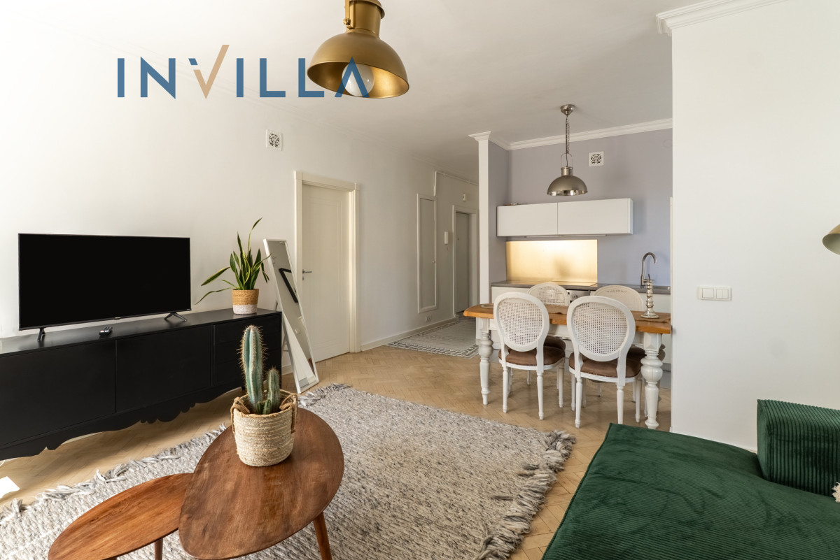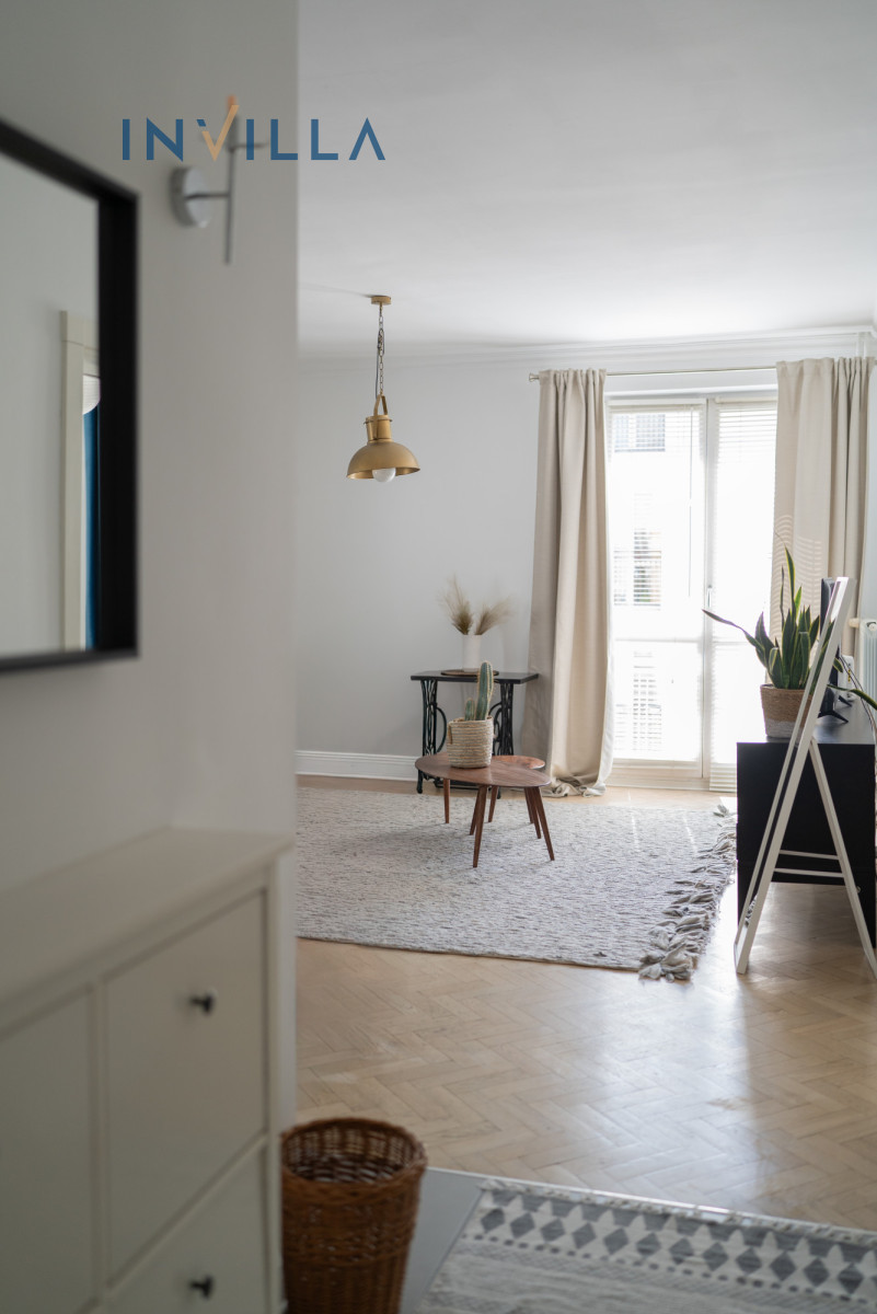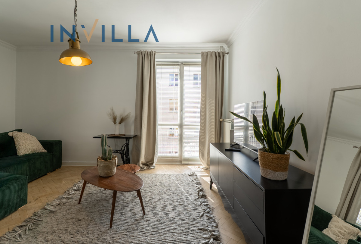 Mieszkanie posiada funkcjonalny rozkład z wysokimi sufitami (ok. 2,75 m), co znacząco podnosi komfort i poczucie przestrzeni. Składa się z ustawnego salonu z aneksem kuchennym oraz oddzielnej sypialni. Na wyposażeniu lokalu znajduje się sprzęt AGD (pralka, zmywarka, piekarnik) oraz telewizor/rzutnik.