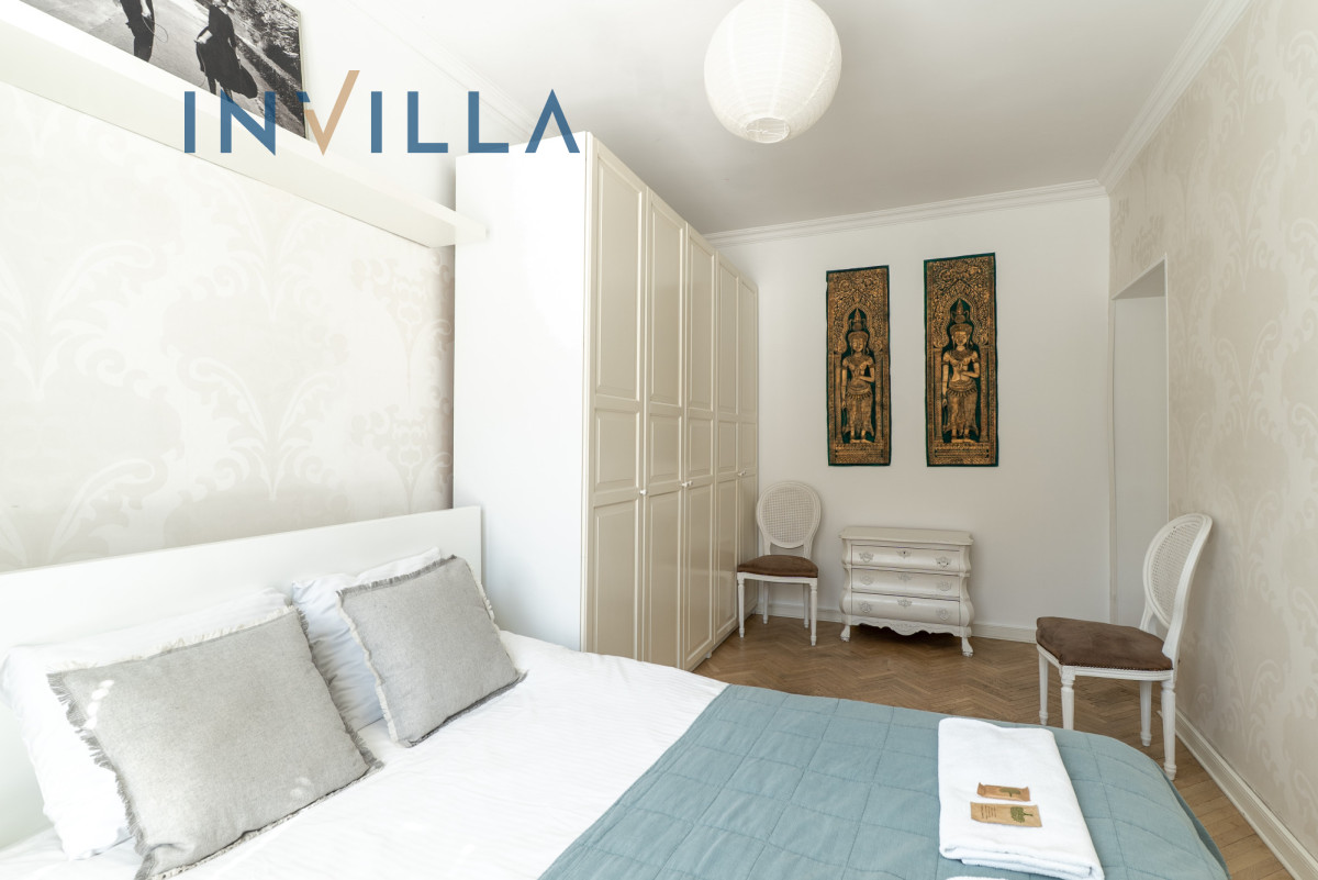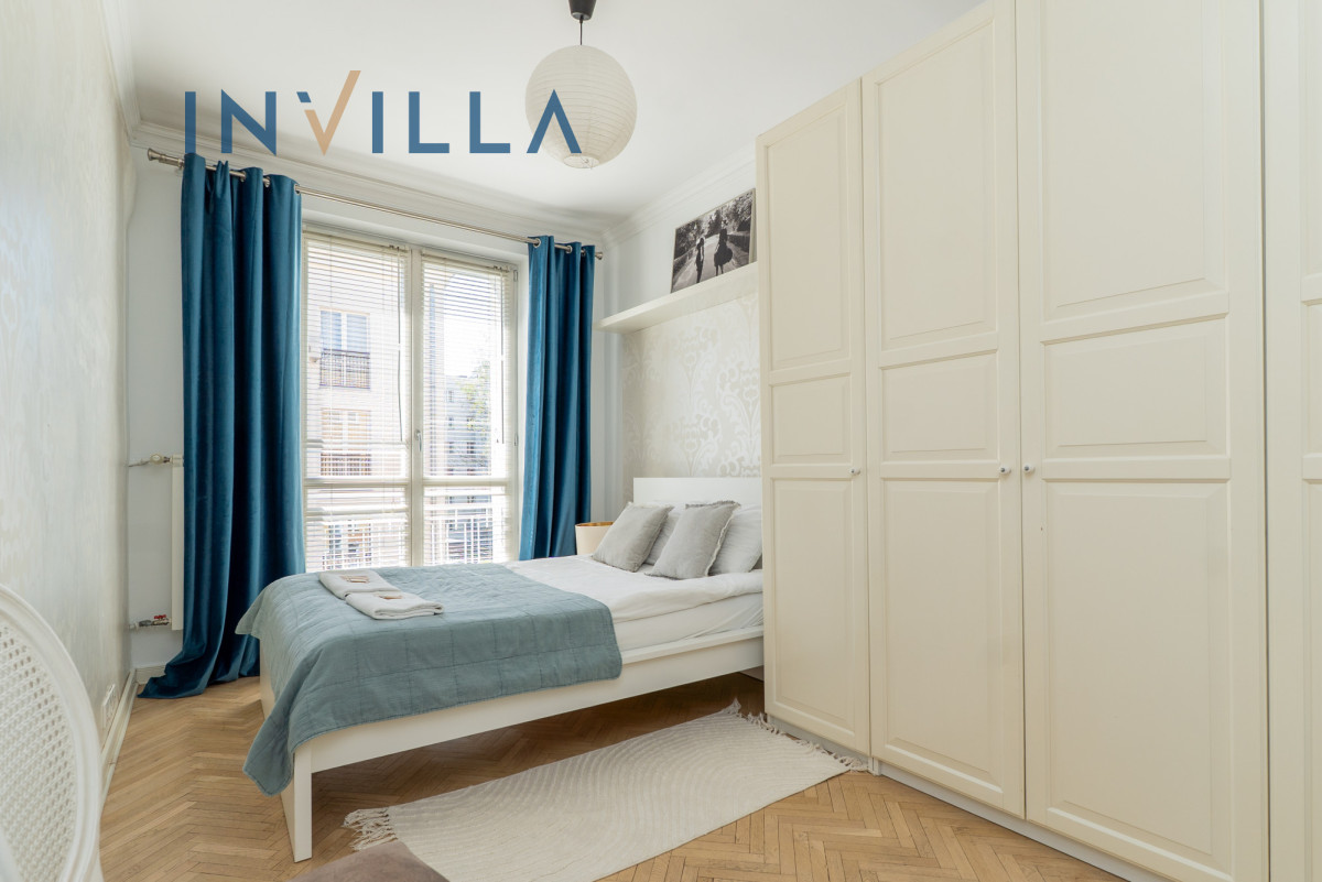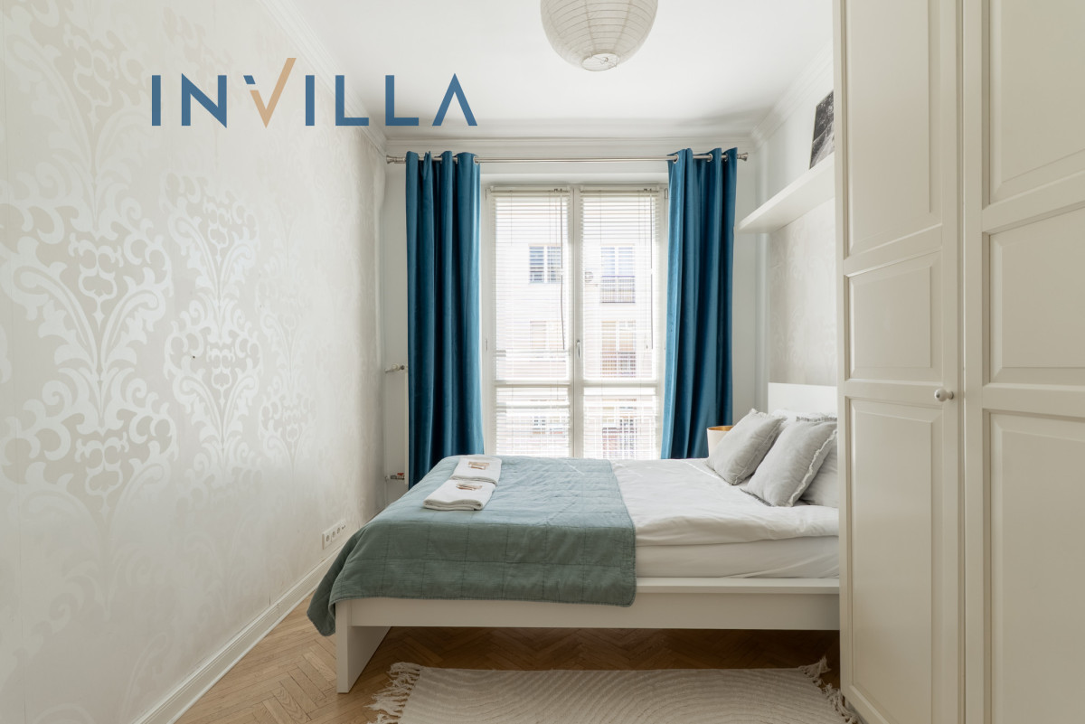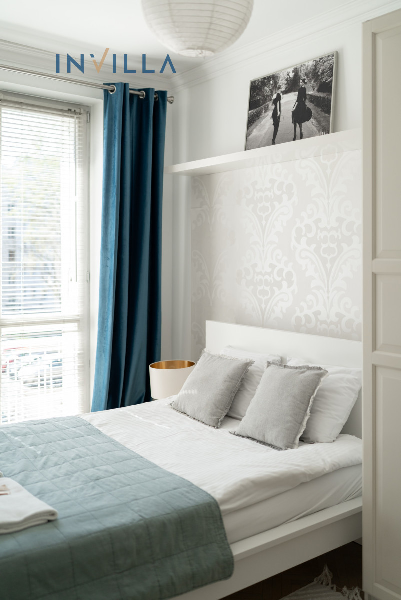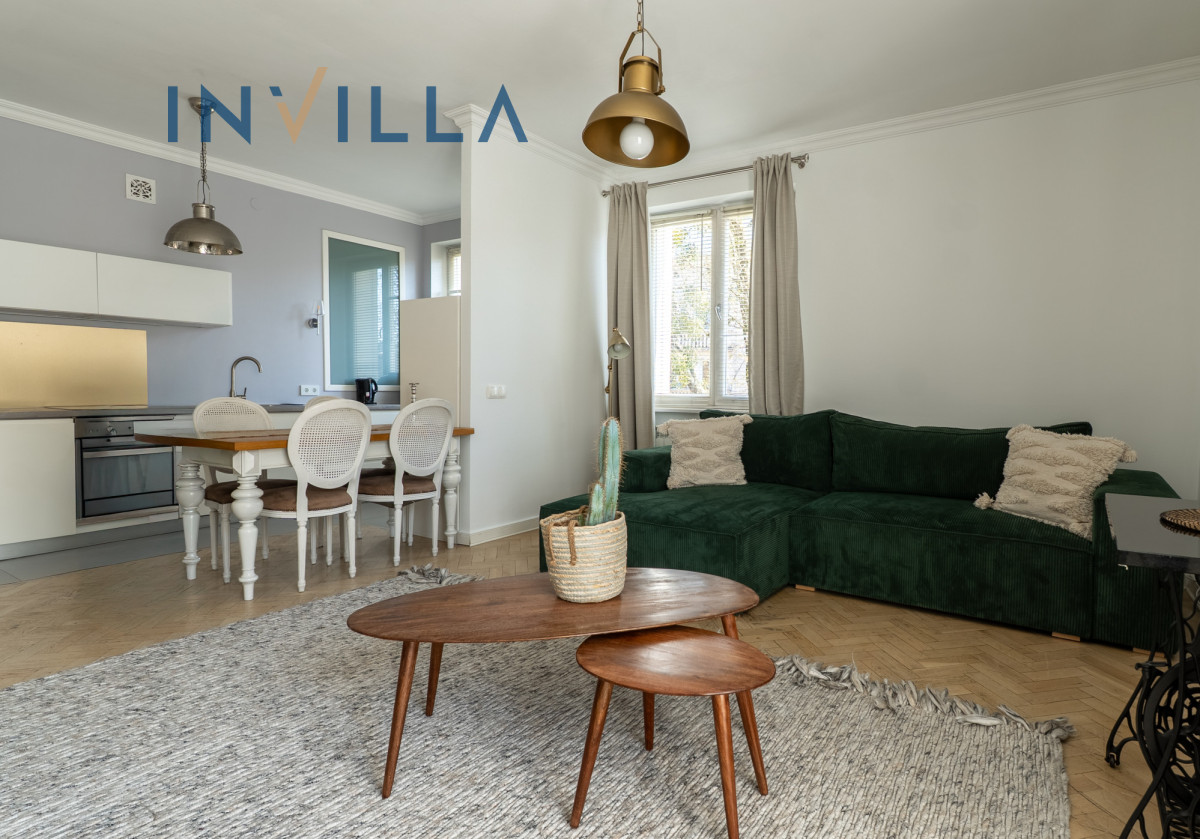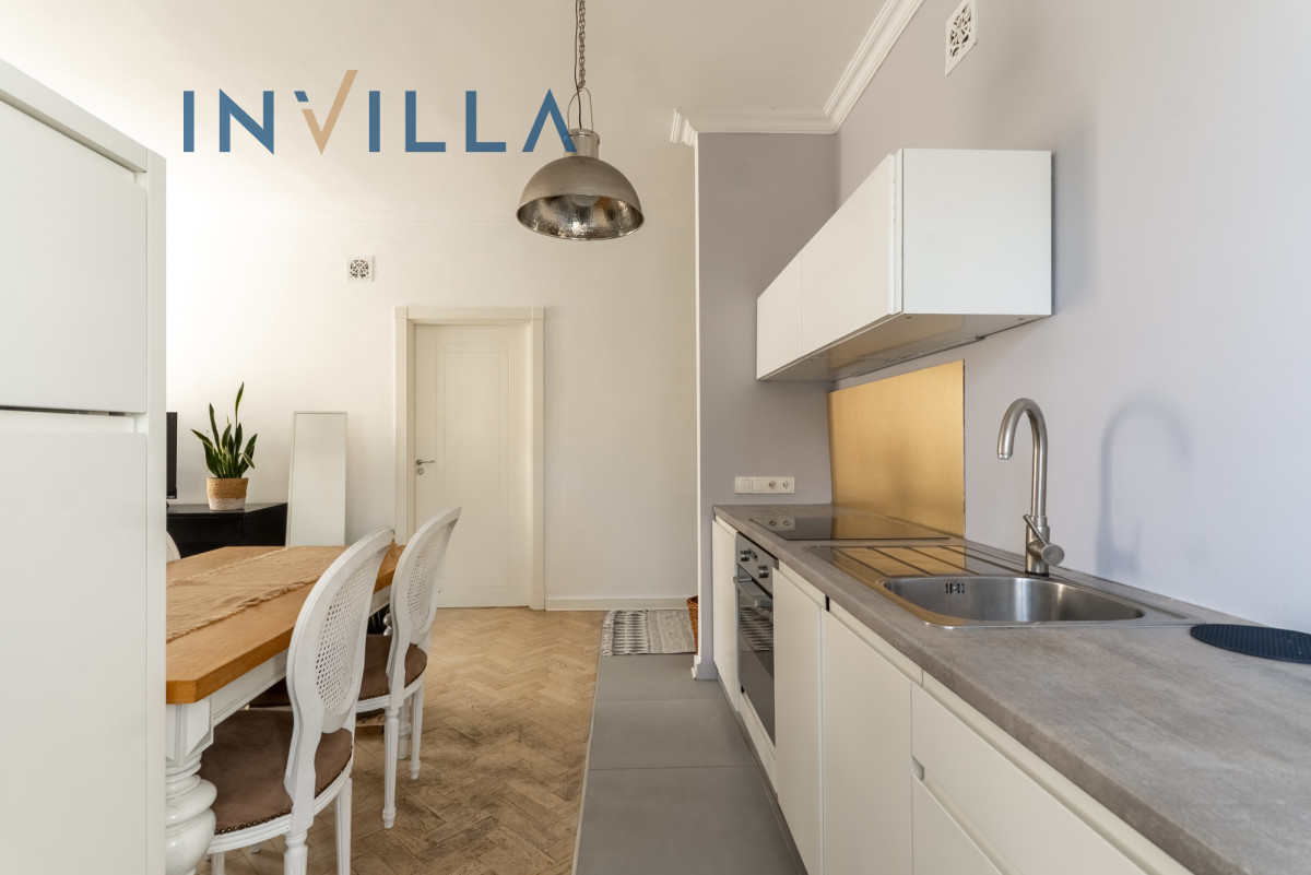 Mieszkanie posiada funkcjonalny rozkład z wysokimi sufitami (ok. 2,75 m), co znacząco podnosi komfort i poczucie przestrzeni. Składa się z ustawnego salonu z aneksem kuchennym oraz oddzielnej sypialni. Na wyposażeniu lokalu znajduje się sprzęt AGD (pralka, zmywarka, piekarnik) oraz telewizor/rzutnik.