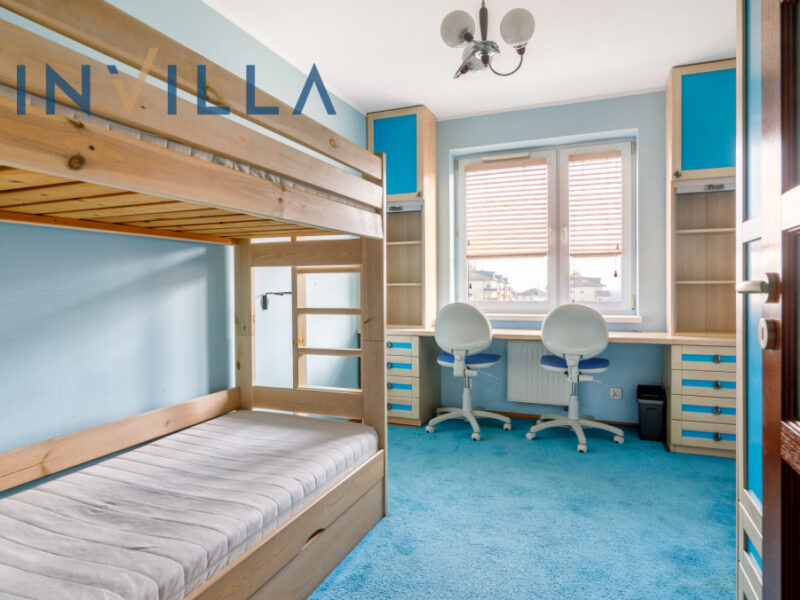 - pokój dziecięcy (11 m2) z łóżkiem piętrowym i dwustanowiskowym biurkiem i szafami,