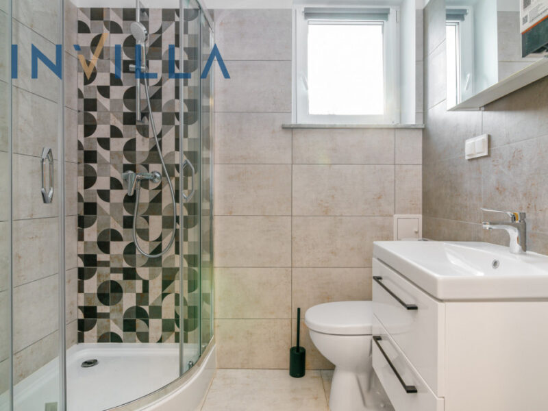 - łazienkę z oknem wyposażoną w kabinę prysznicową.