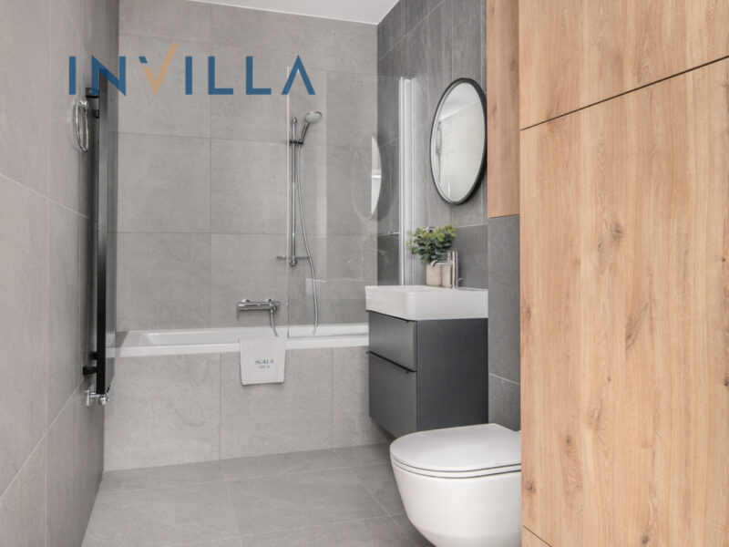 - eleganckiej łazienki z wanną oraz pralko-suszarką w zabudowie, co gwarantuje wygodę i funkcjonalność,