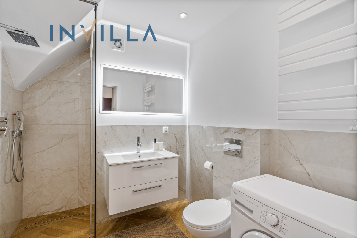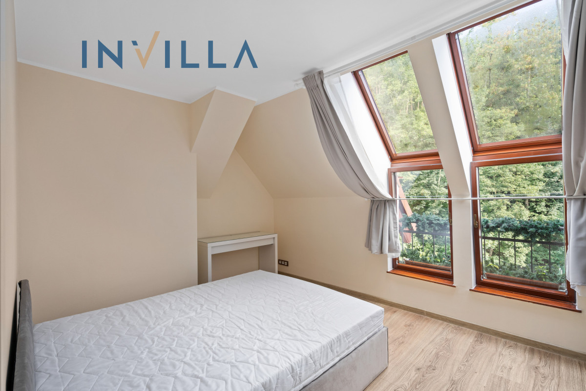 Kuchnia w pełni wyposażona w sprzęt AGD (piekarnik, płyta grzewcza, zmywarka), gotowa do użytku. Sypialnia z dużą szafą w zabudowie i widokiem na las – idealna strefa wyciszenia. Łazienka z kabiną prysznicową, nową armaturą i elegancką glazurą. Przedpokój z praktyczną szafą, która pomieści codzienne okrycia i dodatki. Podłogi wykończone panelami, drewniane okna oraz podwójne okna połaciowe wprowadzają do wnętrza naturalne światło i podkreślają jego przytulny charakter. Istnieje możliwość pozostawienia mebli i sprzętów, co czyni mieszkanie gotowym do wprowadzenia.
