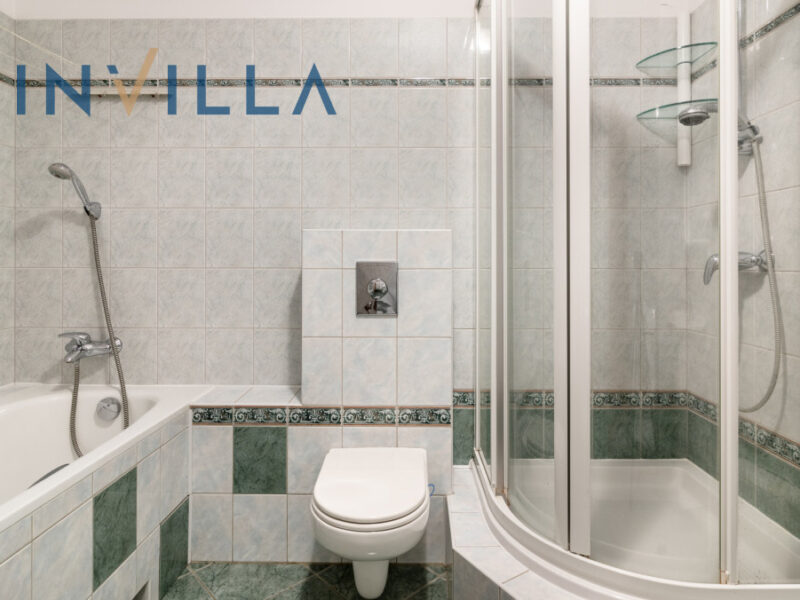 Łazienka wykończona w bardzo eleganckiej stylistyce wyróżnia się niestandardowo dużą wanną i posiada dodatkowo kabinę prysznicową.