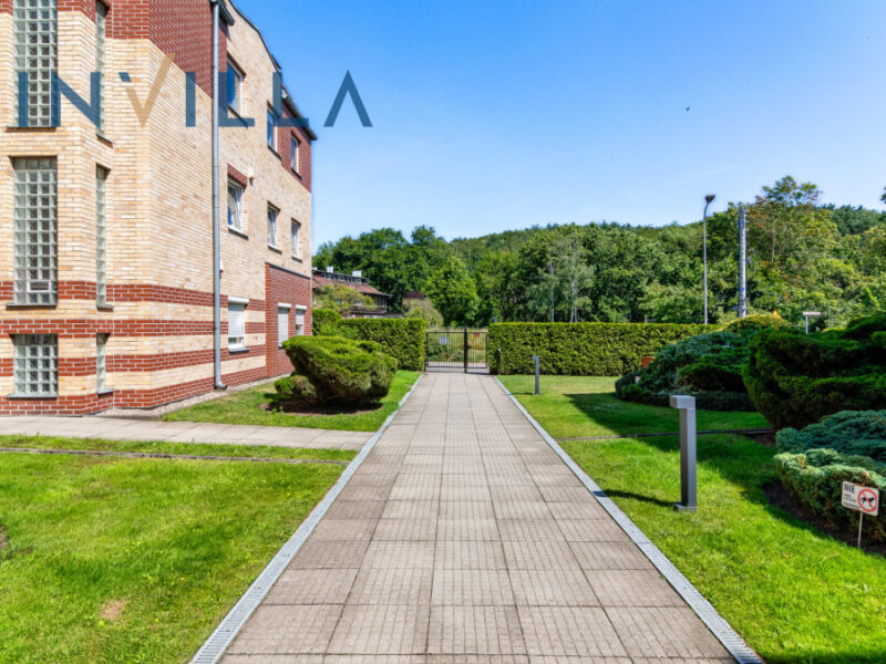 Apartament jest usytuowany na parterze kameralnego apartamentowca położonego na terenie prestiżowego, zamkniętego osiedla w niewielkiej odległości od plaży w Gdyni Orłowie (niecałe 600 m).