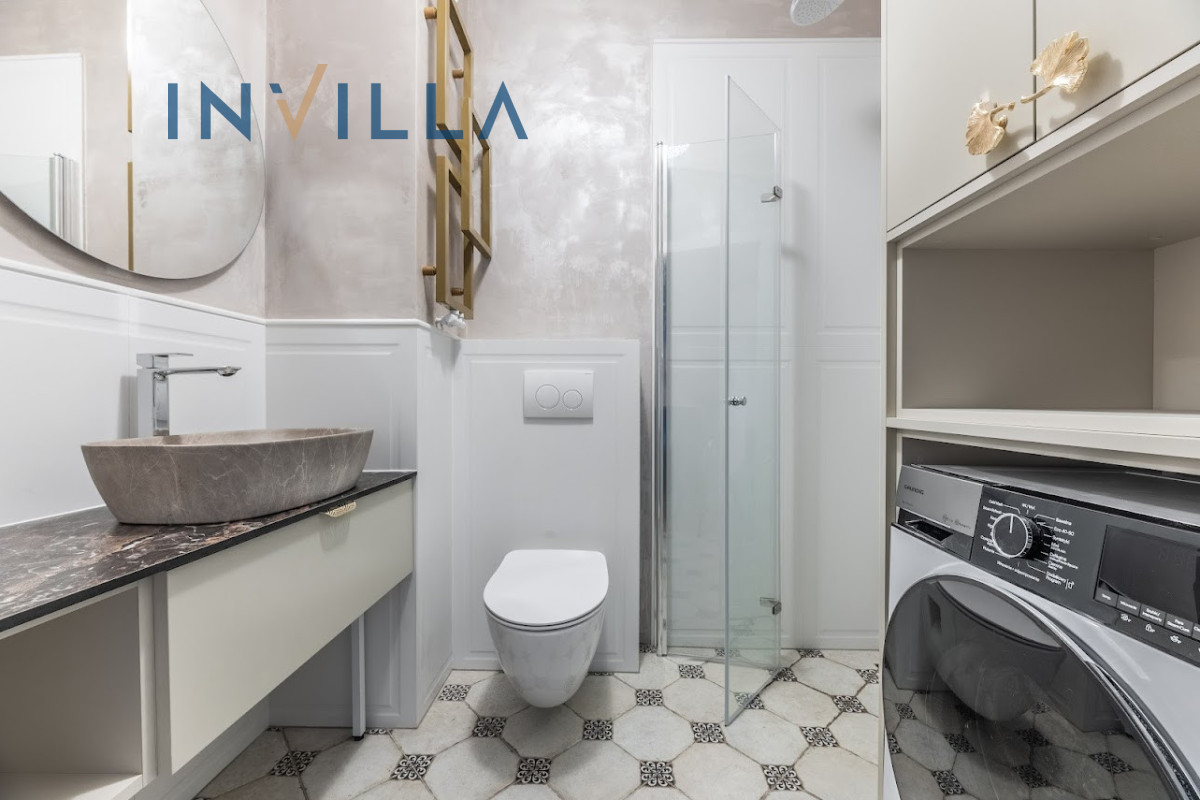 – łazienka z prysznicem i pralką.