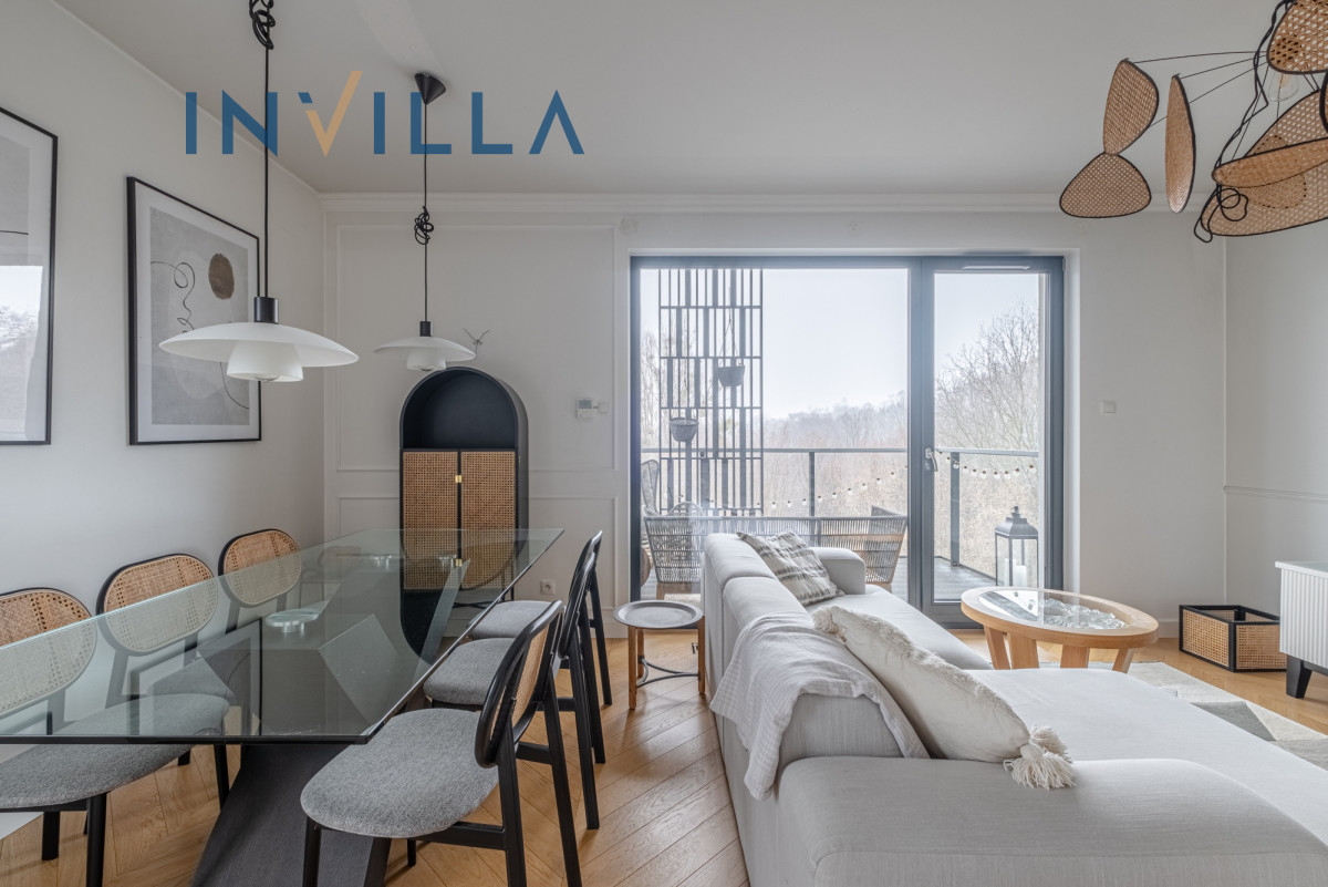 – jasny salon ze stołem jadalnianym i z wyjściem na przestronny balkon z widokiem na zieleń,