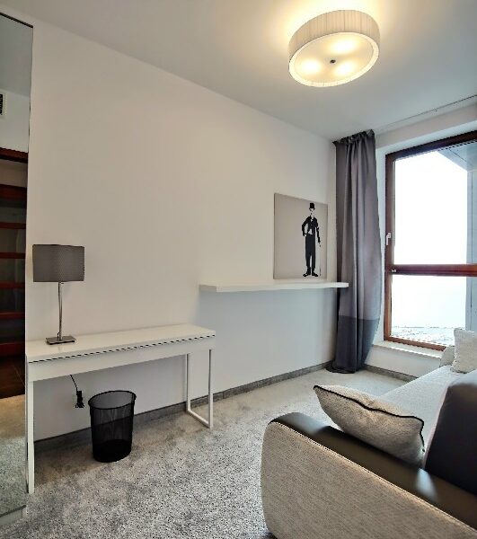 Apartament utrzymany jest w nowoczesnym stylu, w wysokim standardzie, w kolorach szarości i srebra. W salonie znajdują się m.in. skórzane meble i zabudowa TV. Aneks kuchenny jest w pełni wyposażony (lodówka, piekarnik, płyta grzewcza, zmywarka, pralka w zabudowie). W sypialni natomiast umiejscowiona jest przestronna szafa oraz łóżko w rozmiarze king size. Graniczy z nią pokój wielkości 11m2, który może zostać dowolnie zaadaptowany np. na pokój dla dziecka lub biuro.
