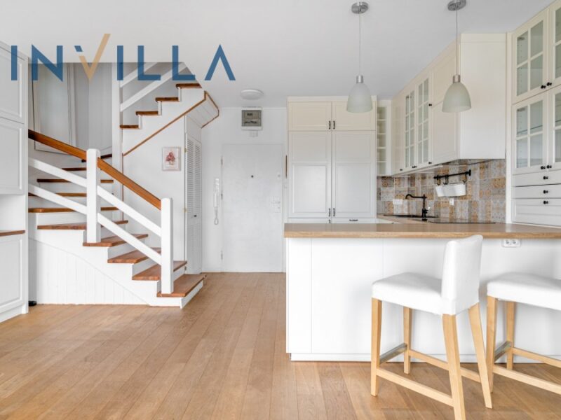 Mieszkanie jest dwupoziomowe i składa się z salonu z aneksem kuchennym, dwóch sypialni, łazienki, małej garderoby i przedpokoju. Mieszkanie jest częściowo umeblowane i całkowicie odświeżone. Poza większością potrzebnych mebli znajdziemy tutaj całkowicie wyposażoną kuchnię i łazienkę. Budynek jest ogrodzony i posiada komórki lokatorskie oraz własny plac zabaw.