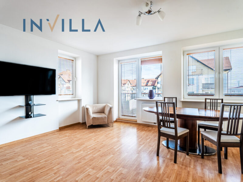 • jasny salon z otwartą kuchnią i wyjściem na balkon,