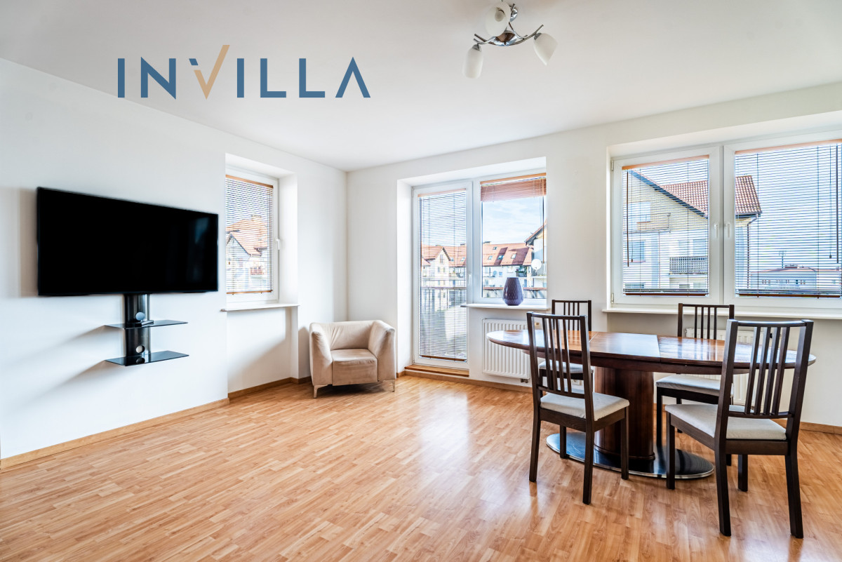 • jasny salon z otwartą kuchnią i wyjściem na balkon,