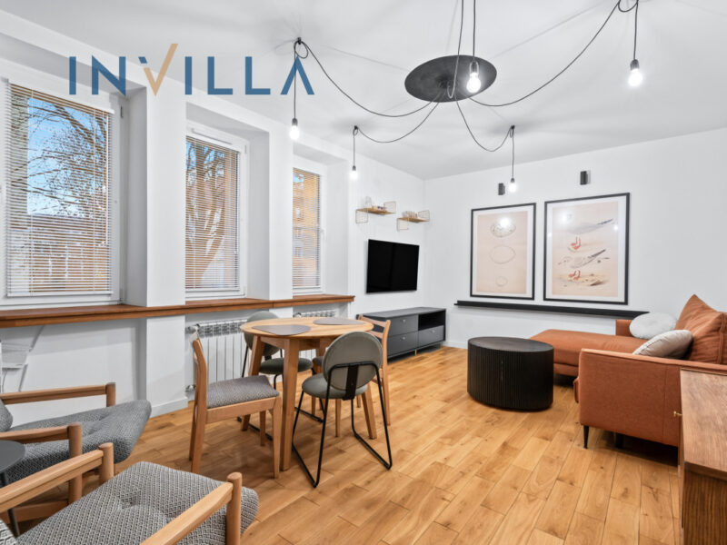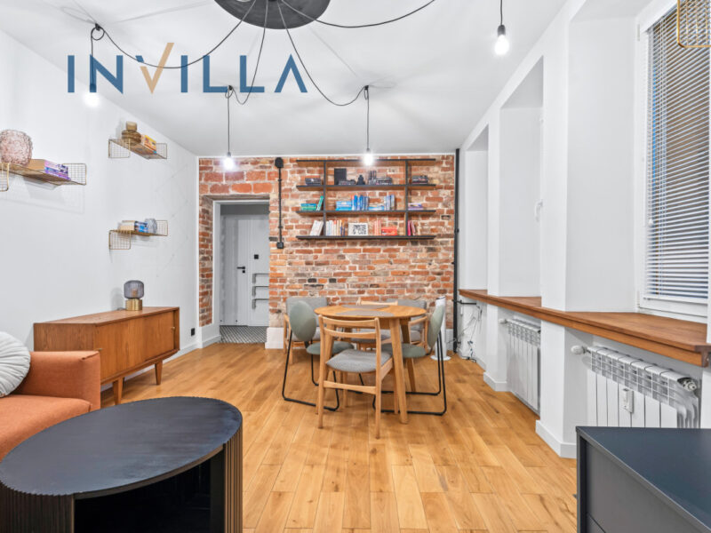 Dwupokojowe mieszkanie o powierzchni 52 metrów, położone na wysokim parterze. Całość składaj się z sypialni, salonu, osobnej kuchni oddzielonej korytarzem oraz dobrze rozplanowanej łazienki i garderoby/schowka przy wejściu. Wnętrze wykończone w bardzo klimatycznym stylu, z duzą ilością przyjemnych akcentów. Na podłogach parkiet i kafle, ściany częściowo ceglane. Dzięki dużej ilość okien wszystkie pomieszczenia są dobrze doświetlone. Aranżacje wnętrza wykonano w funkcjonalny sposób, z odpowiednią ilością przestrzeni do życia oraz pełnym wyposażeniem, w tym AGD i RTV.